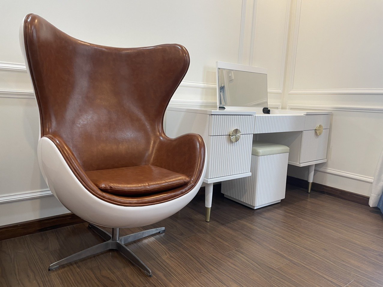Quý khách hàng vui lòng chọn sản phẩm nhà bán JUNO SOFA để nhận được sản phẩm đúng với chất lượng Mẫu ghế Egg Chair trang trí phòng ngủ hiện đại  Điểm độc đáo của ghế trứng là tạo sự riêng tư, yên tĩnh trong không gian yên tĩnh, với thiết kế thông minh với phần tựa ôm cong theo cột sống, giúp người ngồi có sự thoải mái, không ảnh hưởng đến lưng, cổ …. Màu sắc: đa dạng Thân vỏ được làm từ  fiberglass ( sợi thủy tinh) sơn men chống trầy, chống ố Phần nệm bên trong được bọc bằng nỉ, simili hoặc microfiber Phần chân ghế inox vững vàng, có thể xoay 360 độ. Size: H110xD83xW88cm   Trọng lượng 25kg   Sau giờ làm việc căng thẳng thì nhu cầu nghỉ ngơi luôn được ưu tiên, do đó việc trang trí một bộ vừa đáp ứng được nhu cầu, vừa mang lại sự tinh tế.   Tùy theo sở thích, phong cách thiết kế và kích thước phòng ngủ mà bạn hãy lựa chọn cho căn phòng của mình sản phẩm phù hợp nhất.