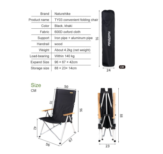 THÔNG TIN SẢN PHẨM - Thương hiệu: NatureHike - Mã sản phẩm: NH17T003-Y - Chất liệu: Vải offord 600D, nhôm, gỗ - Tải trọng tối đa: 120kg - Kích thước sử dụng: 56 x 67 x 96cm - Kích thước gấp gọn: 23 x 90cm - Trọng lượng: 4.2kg - Màu sắc: Đen, kaki - Với 3 góc 95, 105, 125 độ giúp bạn thoải mái ngồi, nằ với nhiều tư thế khác nhau một cách êm ái, dễ chịu nhất. - Với chất liệu từ Nhôm, rất bền bỉ, chắc chắn cùng trọng lượng nhẹ nên dễ dàng mang theo người bằng xe máy, ô tô.