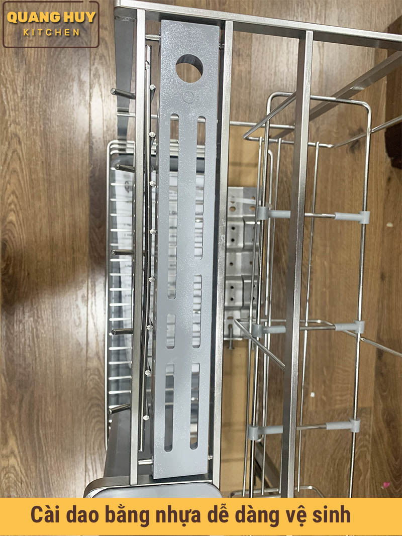 Ngoài để dao thớt giá còn để gia vị nữa với việc thiết kế các thanh cài linh hoạt điều chỉnh vị trí cho phù hợp với các chai lọ khác nhau