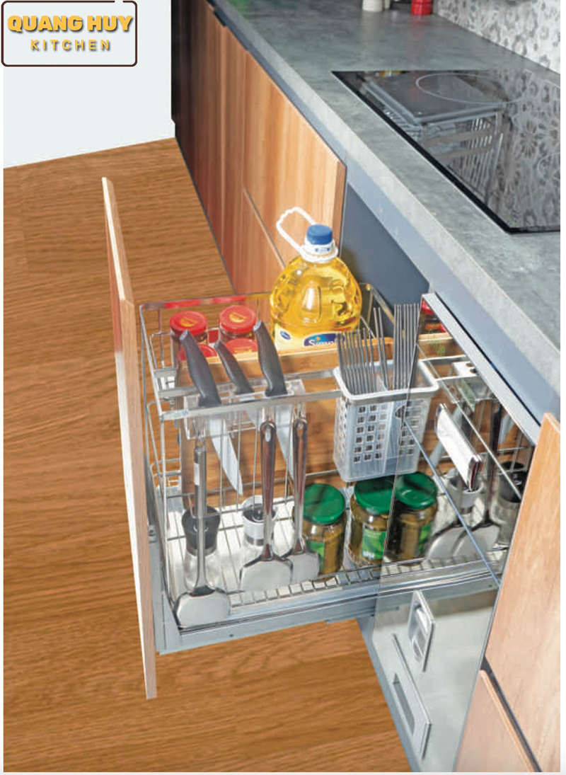 Lắp gắn cánh bạn chỉ cần kéo cánh tủ là đồng thời kéo giá dao thớt ra luôn. Giá được bắt trực tiếp vào cánh tủ