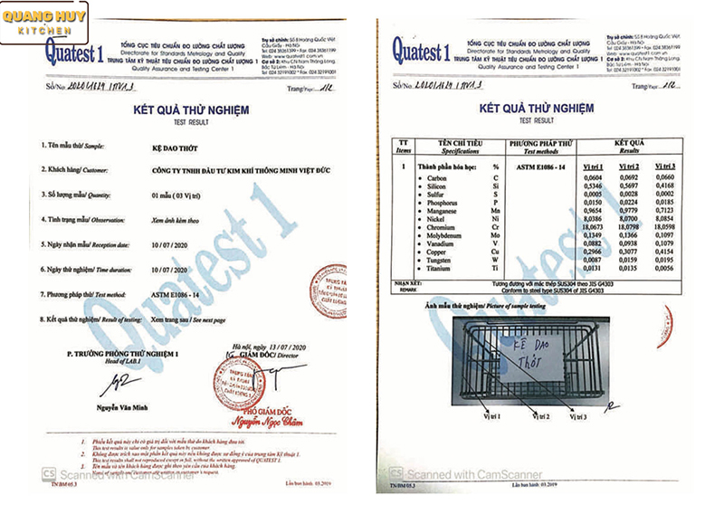 Bên dưới là hình ảnh kết quả thử nghiệm giá dao thớt inox 304 có chất liệu nan chuẩn inox 304 được tổng cục tiêu chuẩn đo lường chất lượng kiểm định