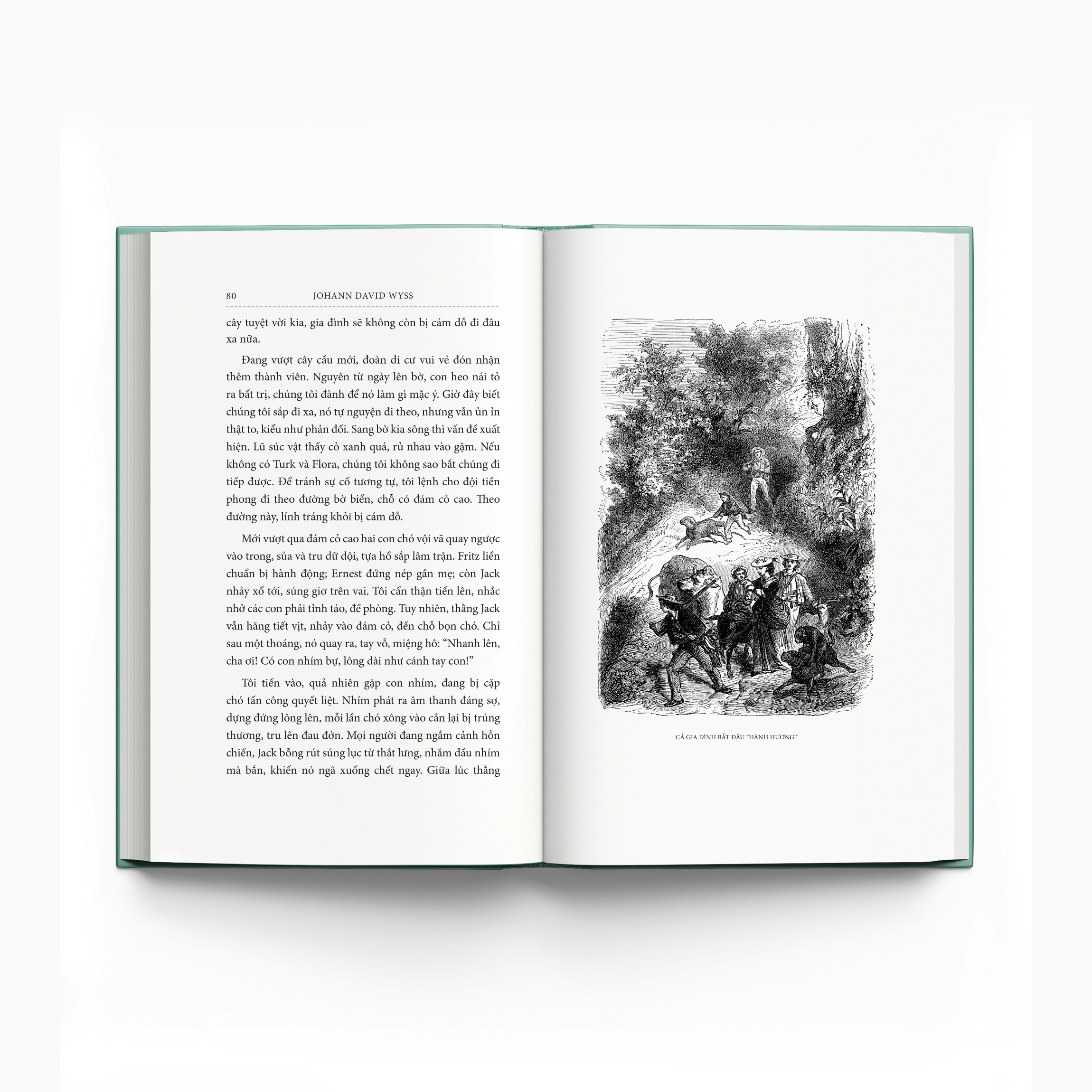 Ấn bản này bổ sung minh họa từ cuốn Le Robinson Suisse ou Histoire d’une famille Suisse naufragée, do Théodore Lefèvre phát hành năm 1877. Sách bìa cứng, bìa bọc bằng vải. Bụng sách được nhũ vàng.