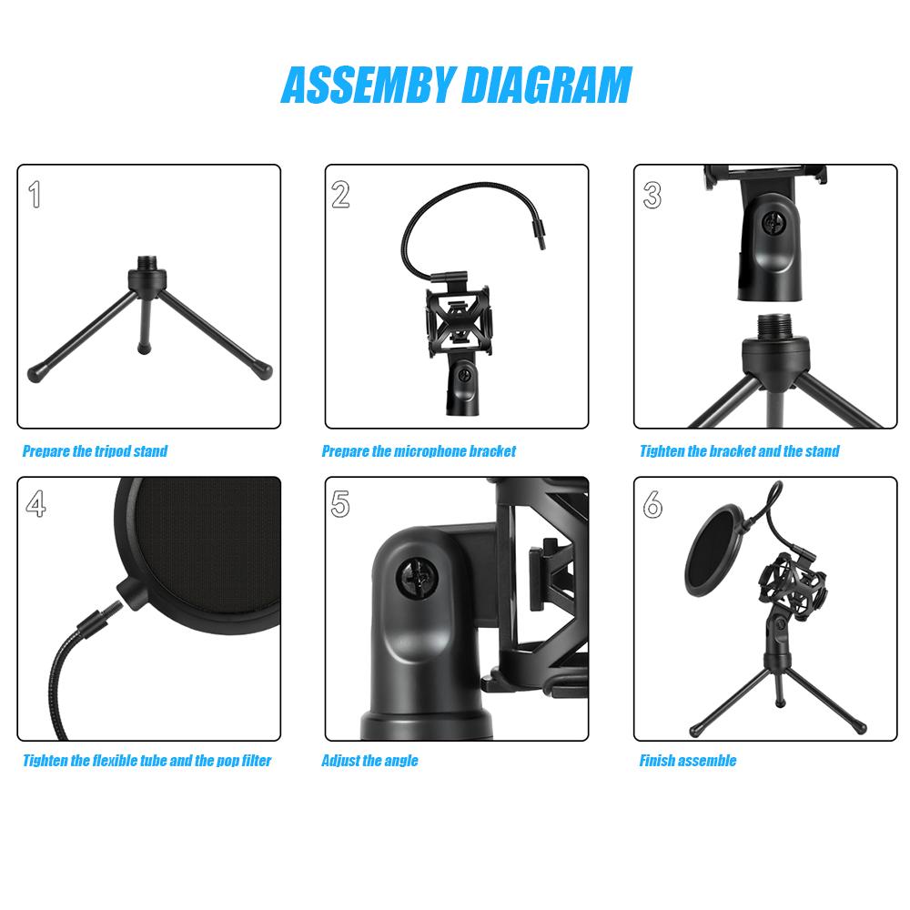 This is an professional mini P-OP filter shockproof microphone desktop stand for studio broadcasting, recording, singing, etc. Easy to install and use! Features: Professional desktop microphone tripod stand for broadcasting, podcasting, online meeting, singing, studio