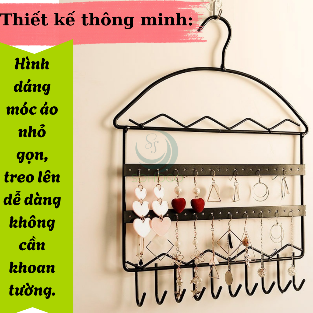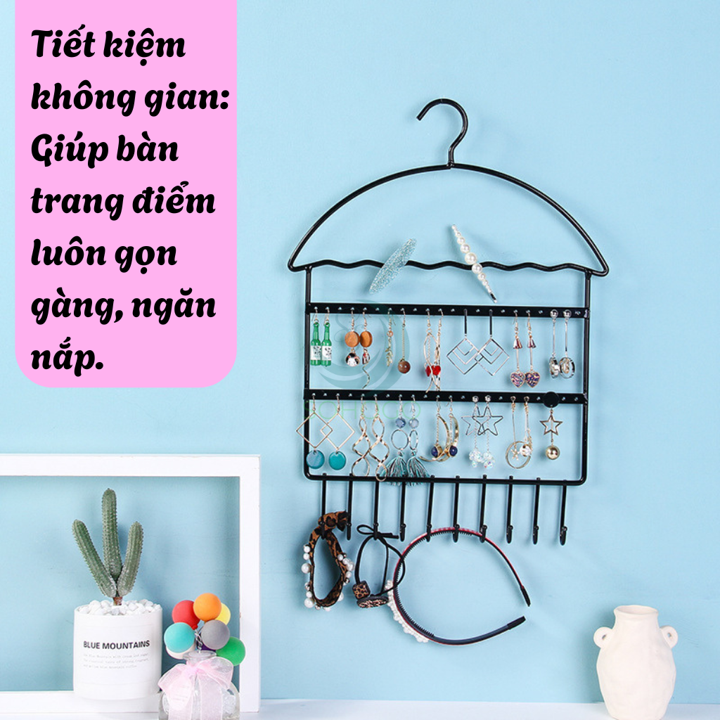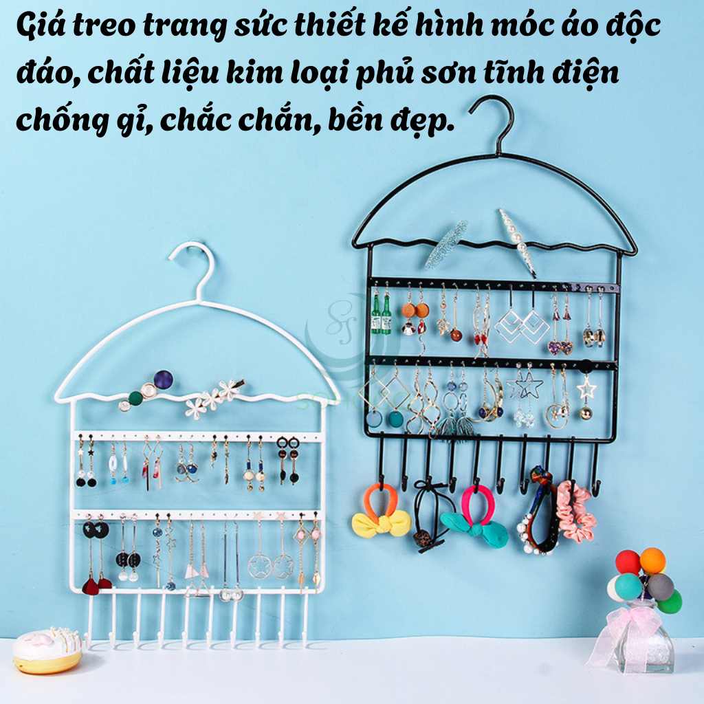 Giá treo trang sức thiết kế hình móc áo độc đáo, chất liệu kim loại phủ sơn tĩnh điện chống gỉ, chắc chắn, bền đẹp. Sản phẩm có nhiều lỗ nhỏ để treo khuyên tai, cùng với hàng móc phía dưới dùng để treo vòng tay, dây chuyền, phụ kiện tóc... Phù hợp cho mọi không gian như bàn trang điểm, phòng ngủ, tiệm làm đẹp.