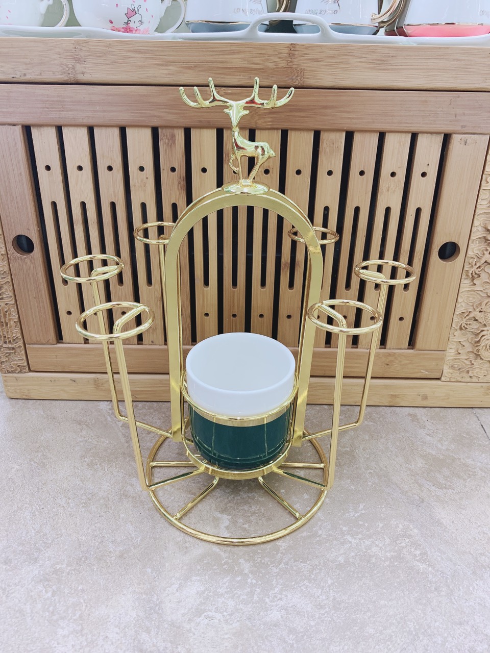 Khay úp cốc 6 chiếc hình gấu mạ vàng, có ống sứ cắm thìa dĩa Giá úp ly, úp cốc mạ vàng kèm ly sứ men xanh đựng dĩa thìa Giá úp có 6 cột
