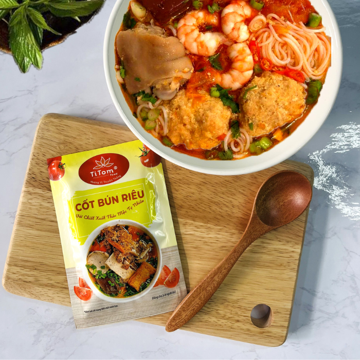 - THÔNG TIN SẢN PHẨM -Cốt bún riêuTitom là gia vị nấu bún riêu nêm sẵn hoàn chỉnh dùng nấu nước lèo bún riêu, bún riêu cua, canh bún cho bạn một nồi nước dùng bún riêu thơm ngon chuẩn vị, không cần nêm nếm. -Sản phẩm mang hương vị bún riêu truyền thống, với bí quyết chiết xuất thảo mộc tự nhiên kết hợp gia vị hoàn chỉnh, giúp nước lèo bún riêu thêm đậm đà mang hương vị truyền thống mà không tốn quá nhiều thời gian của bạn.