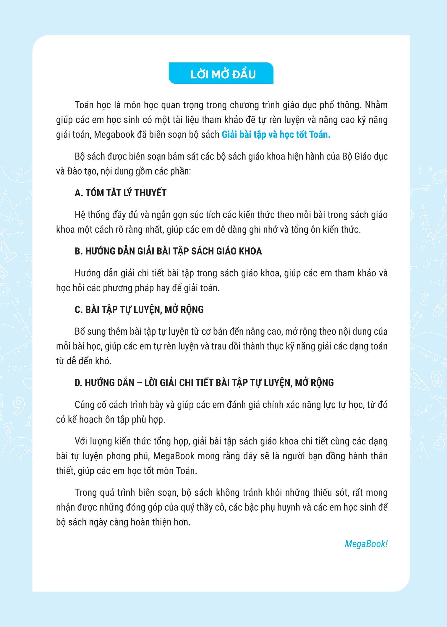 - Hướng dẫn – Lời giải chi tiết bài tập tự luyện, mở rộng Củng cố cách trình bày và giúp các em đánh giá chính xác năng lực tự học, từ đó có kế hoạch ôn tập phù hợp. MegaBook mong rằng đây sẽ là người bạn đồng hành thân thiết, giúp các em học tốt môn Toán.