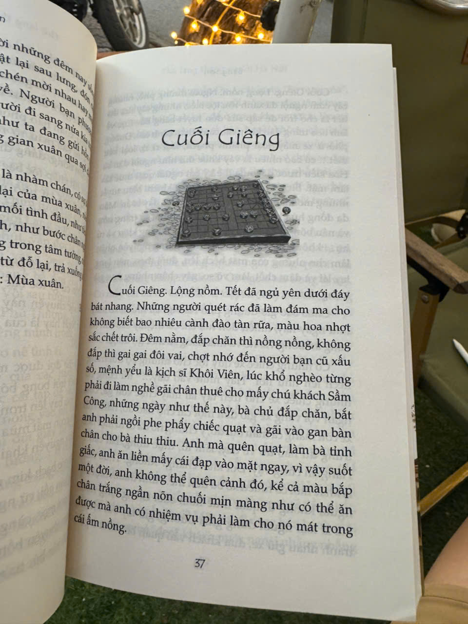 Cứ mặc kệ hàng quán và những tiếng rao ma quái ấy sau lưng, từ ma quái của ngọt lừ, bùi béo của của phấn son ngần ngật… Đế giày cồm cộp, tự bước tự nghe. Bóng sương có ẩm vai thì kéo cái cổ áo lên cho đỡ cơn ho để mà tiếp tục đi, để mà không cần đến một nơi nào cả…”