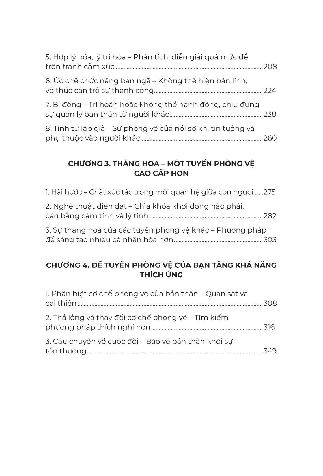 Con người không đơn thuần chỉ tận dụng một phương thức phòng vệ để tự bảo vệ bản thân m.ình. Thông thường, chúng ta sẽ vận dụng một tổ hợp phòng vệ liên kết với nhau, hay còn gọi là “tập hợp phòng vệ”. Khi chúng ta thích nghi với môi trường thường không chỉ sử dụng một phương thức phòng vệ tâm lý, mà bất kỳ tuyến phòng vệ nào cũng có thể trở thành sự lựa chọn tốt nhất vào thời điểm đó. Giải mã cơ chế phòng vệ tâm lý con người sẽ giúp bạn hiểu hết về các cơ chế phòng về thông qua 4 chương sách: