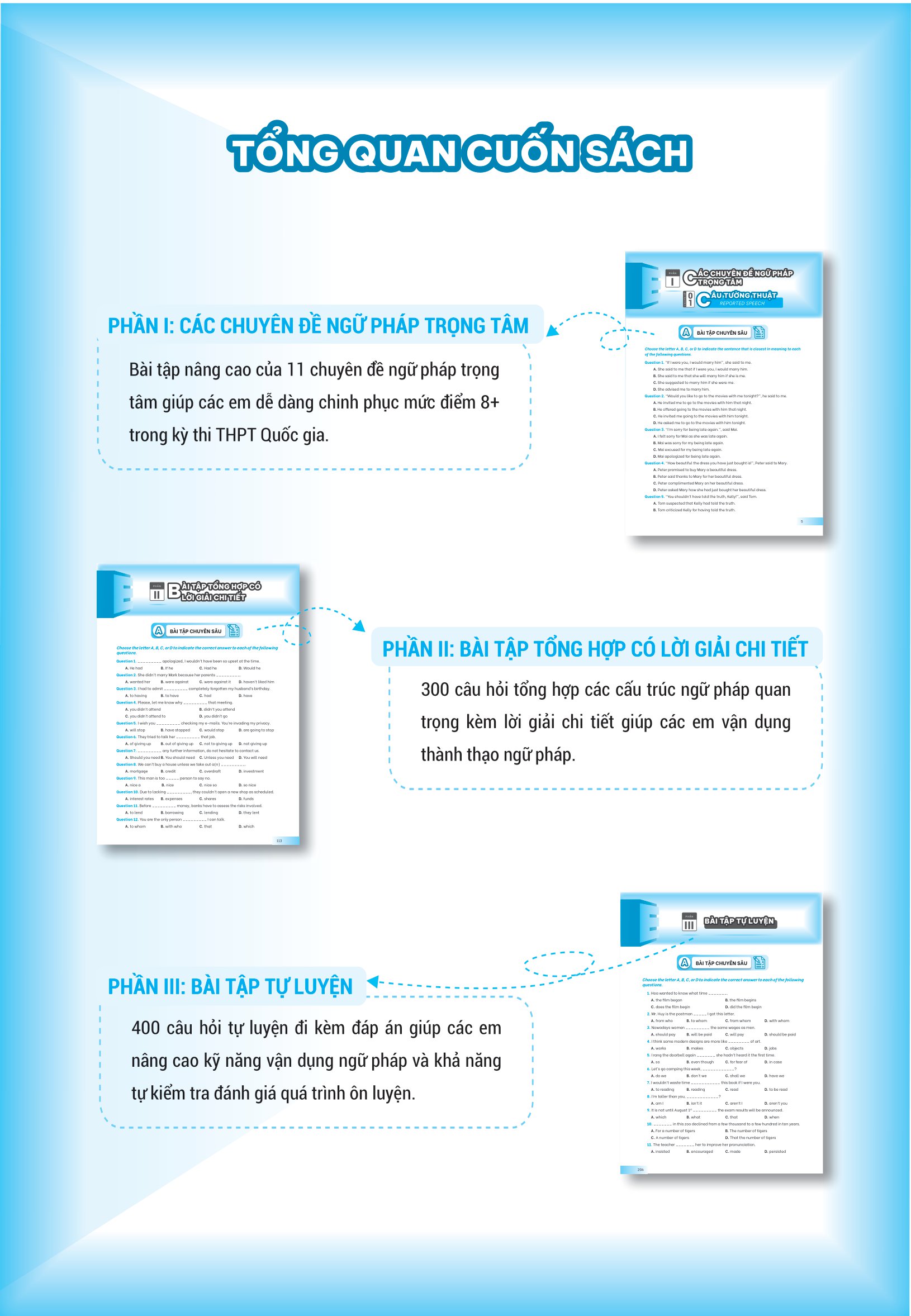 - Hệ thống chuyên đề và bài tập Cuốn sách bao gồm 11 chuyên đề ngữ pháp tiếng Anh trọng tâm, giúp các em học sinh có cơ hội củng cố và nâng cao kiến thức ngữ pháp một cách hiệu quả. Các bài tập trong cuốn sách được thiết kế cẩn thận và kèm theo lời giải chi tiết, giúp học sinh hiểu rõ cách giải quyết và học từ các bài tập.