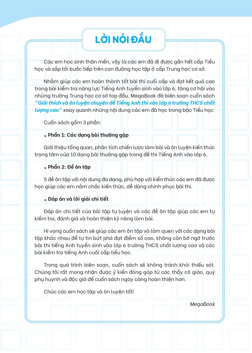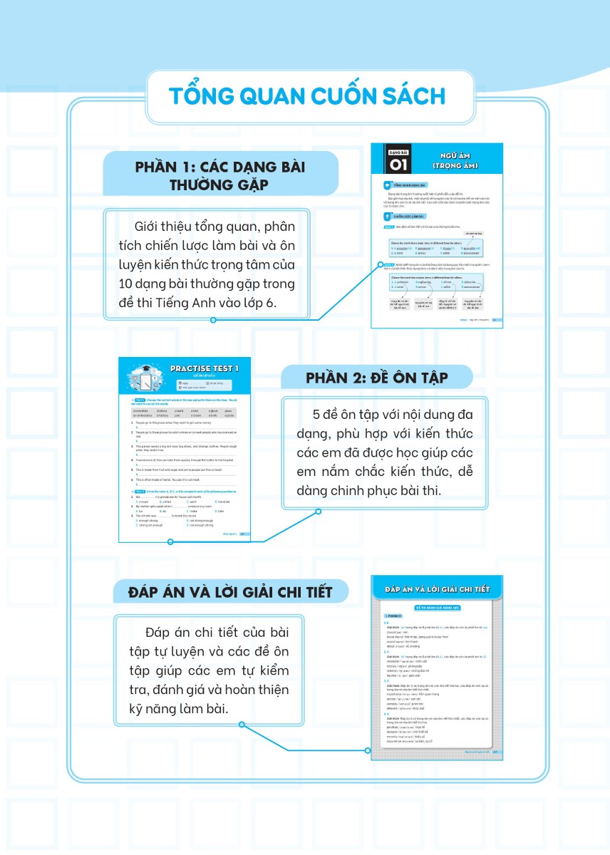 Giới thiệu tổng quan, phân tích chiến lược làm bài và ôn luyện kiến thức trọng tâm của 10 dạng bài thường gặp trong đề thi Tiếng Anh vào lớp 6.