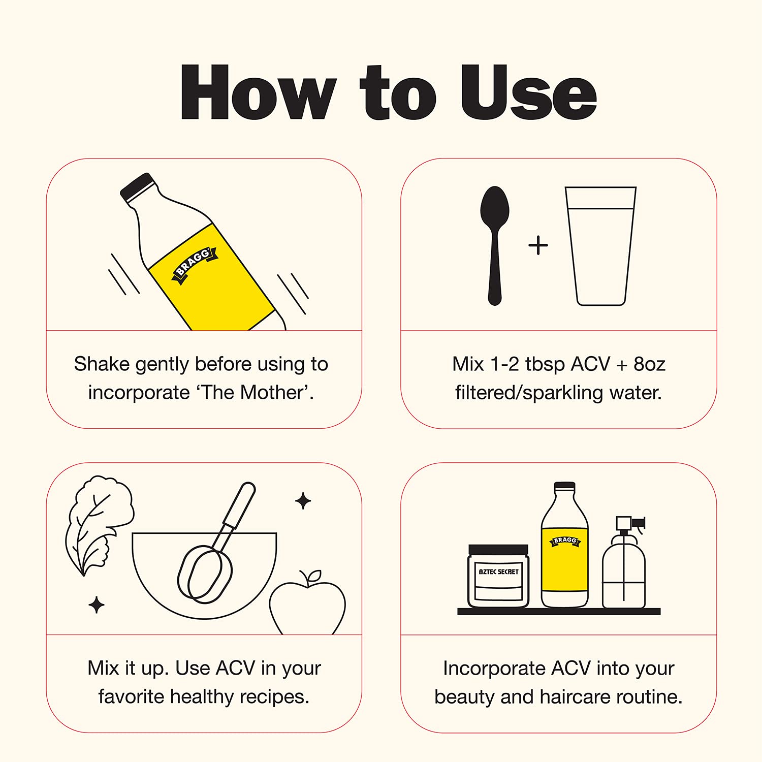 Giấm táo hữu cơ Bragg là thương hiệu nổi tiếng ở Mỹ và toàn cầu. Đây là loại giấm đạt tiêu chuẩn hữu cơ USDA Organic. Đây cũng là loại giấm hữu cơ có chứa 5% acid được làm từ táo hữu cơ được trồng tại Hoa Kỳ, có giấm cái thực sự “sống”, không khử trùng và không lọc. Quá trình thu hái, sản xuất, đóng gói, bảo quản, vận chuyển đều tuân thủ nguyên tắc chặt chẽ của cơ quan thuốc và thực phẩm của Hoa Kỳ FDA. Chính vì vậy mà màu sắc của giấm rất đặc trưng là từ màu hổ phách tới nâu vàng.