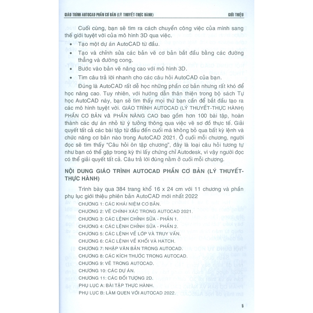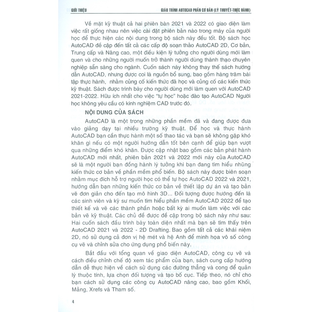 Sách trình bày qua 384 trang khổ 16 x 24 cm với 11 chương và phần phụ lục giới thiệu phiên bản AutoCAD mới nhất 2022