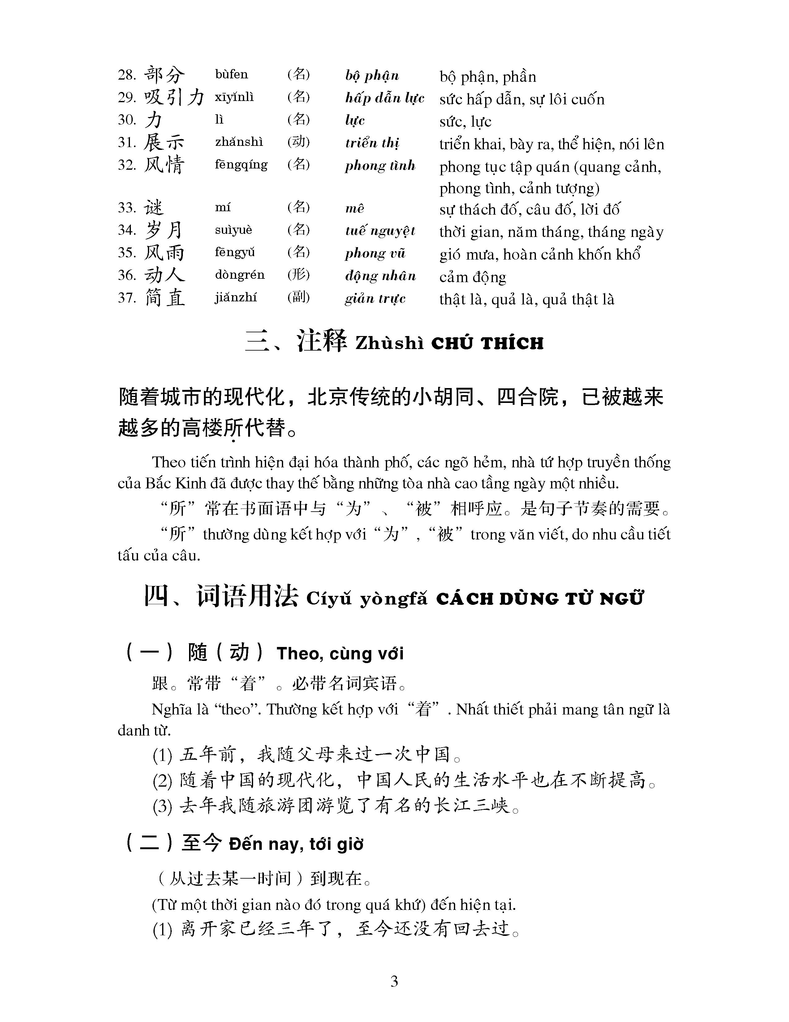 Giáo Trình Hán Ngữ 3 - Tập 2: Quyển Thượng (Phiên Bản 3) Các bài học trong “Giáo trình Hán ngữ” Tập 1 và Tập 2 được thiết kế như sau: 1. Bài đọc, 2. Từ mới, 3. Chú thích, 4. Ngữ âm, Ngữ pháp, 5. Luyện tập. 1. Bài đọc Bài khóa ở Tập 1 và Tập 2 (từ bài 1 đến bài 50) chủ yếu là những đoạn hội thoại thực tế, ngoài ra có biên soạn một vài đoạn văn trần thuật. Bài khóa là một phần quan trọng nhất trong giáo trình, và cũng là nội dung giảng dạy chủ yếu trên lớp. Bài khóa là môi trường để ứng dụng ngữ pháp và từ vựng. Ngữ pháp là cấu trúc khung khi thiết kế bài khóa và cũng là một sợi dây liên kết ngầm. Tách riêng khỏi bài khóa, ngữ pháp sẽ không còn môi trường để ứng dụng. Hoạt động giảng dạy tiếng Hán trên lớp ở giai đoạn sơ cấp nên kết hợp cả ba yếu tố này trên cơ sở tuân thủ nguyên tắc ngữ pháp từ dễ đến khó. Phải giúp cho sinh viên hiểu ngữ cảnh sử dụng câu, để sinh viên từng bước nắm được cách biểu đạt câu từ cho chính xác trong từng ngữ cảnh cụ thể. Mục đích của chúng ta là lấy ngữ pháp làm kim chỉ nam cho việc học bài khóa, thông qua kỹ xảo như đọc diễn cảm, đọc thuộc, viết lại bài khóa… để nâng cao kỹ năng nghe, nói, đọc, viết cho sinh viên và củng cố khả năng giao tiếp xã hội bằng tiếng Hán. Việc giảng dạy trên lớp nên chú ý tập trung cho sinh viên nghe, đọc, nói lại bài khóa. Tất cả các phần như từ mới, chú thích, và ngữ pháp đều phục vụ cho việc dạy và học bài khóa. 2. Từ mới Ở Tập 1 và Tập 2 của bộ giáo trình có tổng cộng hơn 1600 từ mới. Tiêu chí lựa chọn những từ này chính là tần suất sử dụng thường xuyên của nó. Hơn nữa mỗi bài chỉ có một lượng từ nhất định. Trên lớp, các thầy cô hãy giảng dạy từ mới trong câu bởi chỉ có câu và bài khóa mới có khả năng quy định tính duy nhất về nghĩa của từ. 3. Chú thích Phần chú thích trong giai đoạn ngữ âm chủ yếu giới thiệu kiến thức cơ bản về ngữ âm tiếng Hán. Còn ở giai đoạn ngữ pháp và mẫu câu, chủ yếu giới thiệu và giải thích một số kiến thức trọng điểm về ngôn ngữ và bối cảnh văn hóa Trung Quốc. Đối với những câu có điểm ngữ pháp xuất hiện trong bài khóa nhưng chưa được giải thích, hãy để sinh viên được hiểu nghĩa thông qua phần dịch nội dung chú thích. 4. Ngữ âm, ngữ pháp Bộ giáo trình dành 10 bài để giảng dạy ngữ âm. Nhưng nói một cách nghiêm túc, việc luyện tập ngữ âm, ngữ điệu cần phải xuyên suốt cả giai đoạn sơ cấp. Tầm quan trọng của việc luyện tập ngữ âm là rất lớn và cần đặc biệt nhấn mạnh. Phải lưu ý rằng, ở giai đoạn mẫu câu và đoạn văn, việc giảng dạy ngữ âm cần được tiến hành kết hợp với việc luyện đọc to và học thuộc bài khóa. Các bài luyện đọc ngữ âm được thiết kế trong phần bài tập chỉ mang tính chất gợi ý. Phần ngữ pháp của giáo trình sẽ không quá chú trọng tính hệ thống, thế nhưng nó được biên soạn theo nguyên tắc từ dễ đến khó, nắm bắt dần dần. Vì vậy, nếu không hoàn thành tốt nhiệm vụ giảng dạy của Tập 1 và Tập 2 mà giảng dạy ngay vào Tập 3 sẽ gặp phải nhiều khó khăn. Cần nhấn mạnh rằng, bộ giáo trình này dựa vào cấu trúc ngữ pháp tiếng Hán để giảng dạy bài đọc, dạy sinh viên nói tiếng Trung theo kết cấu ngữ pháp. Do đó, việc giải thích ngữ pháp cần ngắn gọn, rõ ràng, đơn giản, mạch lạc, bắt đầu từ cấu trúc ngữ pháp rồi giải thích ngữ nghĩa, chức năng, ngữ dụng; dạy sinh viên cách vận dụng ngữ pháp để nói, viết, biểu đạt tiếng Hán. Trên lớp, giáo viên có thể sử dụng nhiều phương pháp hình tượng, trực quan như tranh ảnh, động tác, phần mềm máy tính… để giảng giải các hiện tượng ngữ pháp, giúp sinh viên nắm bắt ý nghĩa, chức năng và ngữ cảnh của từng điểm ngữ pháp nhằm nâng cao khả năng giao tiếp bằng tiếng Hán của sinh viên. 5. Luyện tập Các bài tập trong giáo trình chú trọng nguyên tắc học tập đi từ lý giải, mô phỏng, ghi nhớ, thành thạo rồi đến ứng dụng. Các dạng bài tập bao gồm bài tập lý giải, bài tập mô phỏng và bài tập giao tiếp,… hỗ trợ cả nhu cầu học trên lớp lẫn nhu cầu tự học ở nhà. Giáo viên có thể ứng dụng linh hoạt theo tình hình giảng dạy thực tế. Giảng dạy tiếng Hán cho người nước ngoài khác với việc giảng dạy tiếng Hán cho người Trung Quốc ở chỗ, giảng dạy yếu tố ngôn ngữ không thể tiến hành độc lập. Quá trình giảng dạy các yếu tố ngôn ngữ chính là quá trình rèn luyện kỹ năng ngôn ngữ và kỹ năng giao tiếp ngôn ngữ. Trên lớp, giáo viên và sinh viên nên tương tác, kết hợp giảng dạy lẫn thực hành. Cho dù là dạy ngữ âm, ngữ pháp, mẫu câu hay từ vựng, đoạn văn đều cần tuân thủ nguyên tắc thực hành là hàng đầu, giao tiếp là chủ đạo, tinh giảng đa luyện. Có như vậy, chúng ta mới đạt được hiệu quả giảng dạy tối ưu.