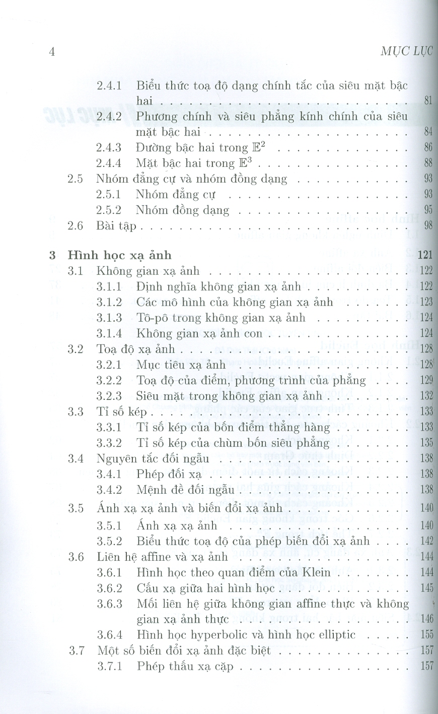 Giáo trình gồm 5 chương, trình bày những kiến thức cơ bản cốt lõi của Hình học affine, Hình học Euclid, Hình học xạ ảnh, Mặt phẳng định hướng, Đa diện đều và nhóm con hữu hạn của nhóm SO(3).