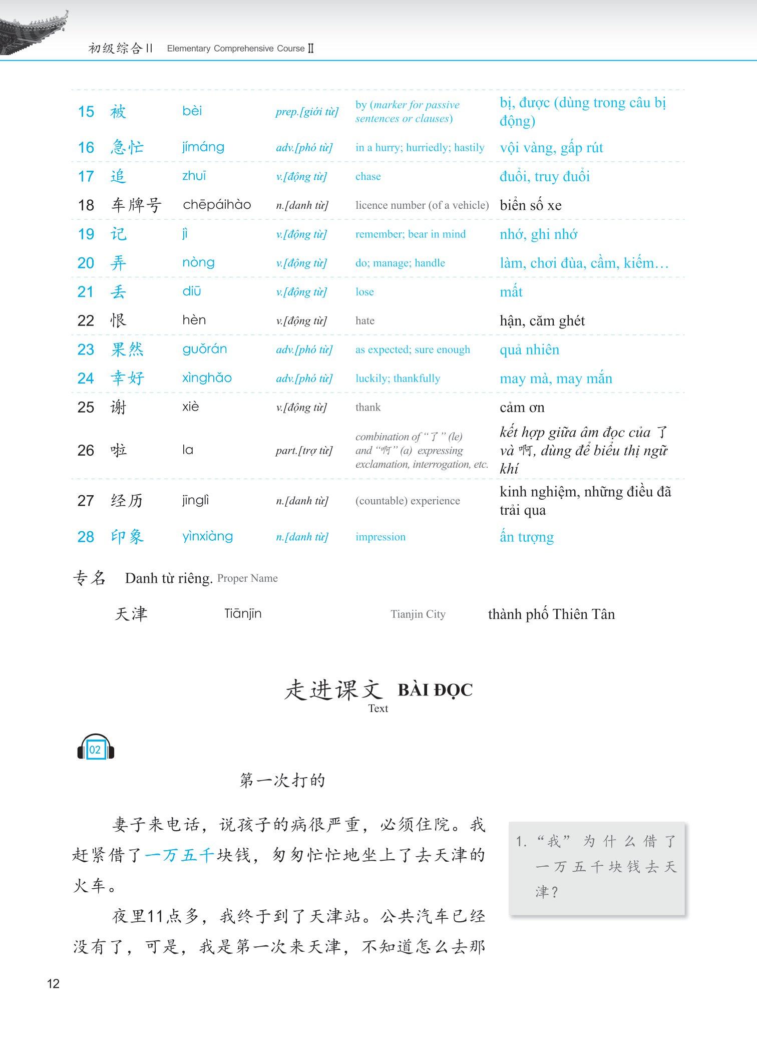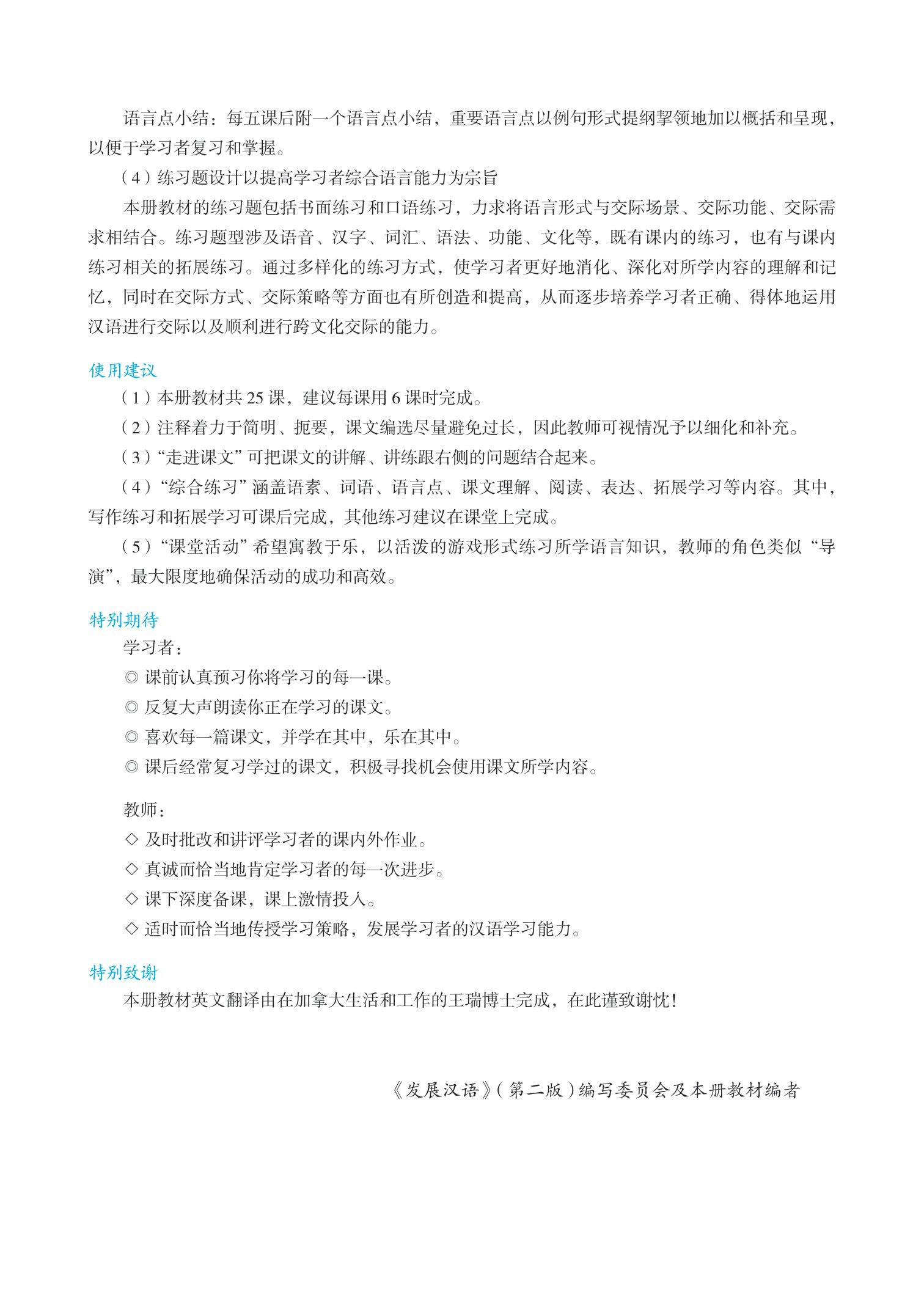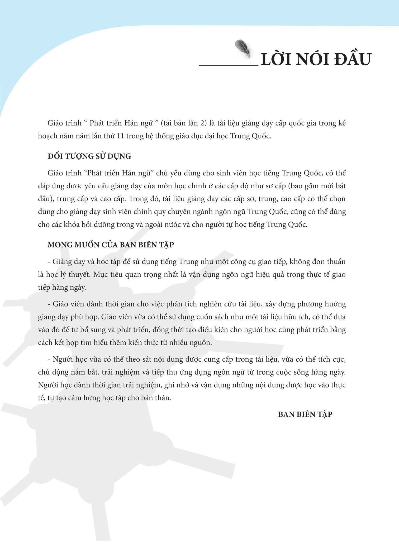 Giáo trình Phát triển Hán ngữ tổng hợp sơ cấp 2 – Tập 2 chủ yếu dùng cho sinh viên học tiếng Trung Quốc, có thể đáp ứng được yêu cầu giảng dạy của môn học chính ở các cấp độ như sơ cấp (bao gồm mới bắt đầu). Bên cạnh đó, cuốn sách này có thể chọn dùng cho giảng dạy sinh viên chính quy chuyên ngành ngôn ngữ Trung Quốc, cũng có thể dùng cho các khóa bồi dưỡng trong và ngoài nước và cho người tự học tiếng Trung Quốc.