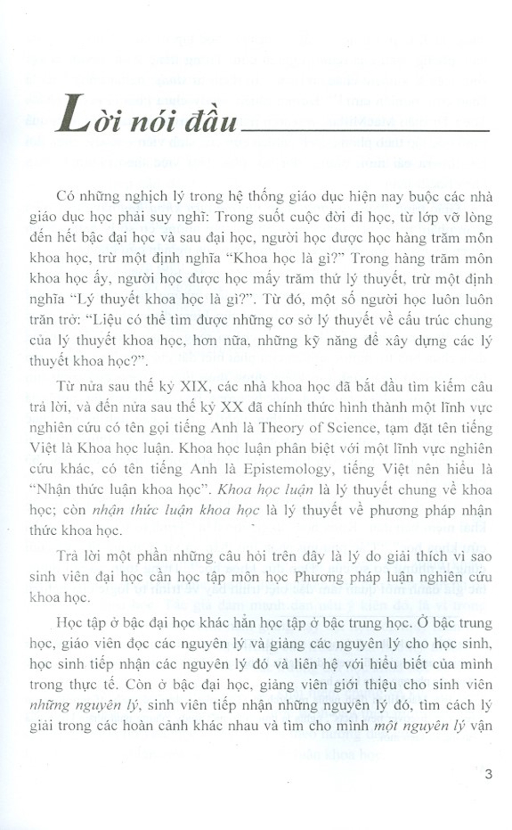 Theo tính chất của một tài liệu giáo khoa, cuốn sách trình bày từ các khái niệm ban đầu “Khoa học” là gì, cho đến “Trình tự lôgic của nghiên cứu khoa học”, “Các phương pháp thu thập và xử lý thông tin” và cuối cùng là những cơ sở của “Đạo đức khoa học”. Trong toàn bộ nội dung, tác giả dành mối quan tâm đặc biệt trình bày về trình tự lôgic của nghiên cứu khoa học. Qua kinh nghiệm những năm giảng dạy môn học này, tác giả nhận thấy rằng, trình tự lôgic của nghiên cứu khoa học là khâu yếu nhất của sinh viên và nghiên cứu sinh hiện nay. Trong một số cuộc trao đổi về phương pháp luận khoa học, một vị giáo sư khẳng định, chỉ cần dạy cho sinh viên về “nhận thức luận Mác – Lênin” là đủ. Có thể ý kiến đó là đúng, nhưng chưa đủ. Nhận thức luận, triết học chỉ dạy cho người học về cách tiếp cận để đi đến nhận thức, chẳng hạn, phải đi từ “trực quan sinh động đến tư duy trừu tượng” … Nhưng ngay cả mệnh đề đó cũng không hề cung cấp cho họ về trật tự các kỹ năng thao tác để có thể đưa ra những kết luận khoa học. Ở đâu đó, một nhà nghiên cứu đã nói, khoa học chỉ ra điều hay, lẽ phải cho đủ mọi ngành nghề, trong khi hàng loạt thầy cô đã hướng dẫn nghiên cứu khoa học cho trò vẫn theo phương pháp truyền nghề của các nghệ nhân. Trong giáo trình này, tác giả cố gắng trình bày theo hướng tiếp cận phương pháp luận thoát khỏi khuôn khổ của phương pháp truyền nghề của các nghệ nhân.