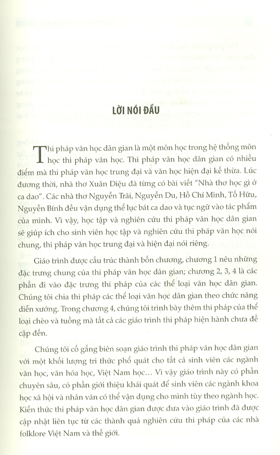 Chúng tôi cố gắng biên soạn giáo trình thi pháp văn học dân gian với một khối lượng tri thức phổ quát cho tất cả sinh viên các ngành văn học, văn hóa học, Việt Nam họ Vì vậy giáo trình này có phần chuyên sâu, có phần giới thiệu khái quát để sinh viên các ngành khoa học xã hội và nhân văn có thể vận dụng cho mình tùy theo ngành học. Kiến thức thi pháp văn học dân gian được đưa vào giáo trình đã được cập nhật liên tục từ các thành quả nghiên cứu thi pháp của các nhà folklore Việt Nam và thế giới.