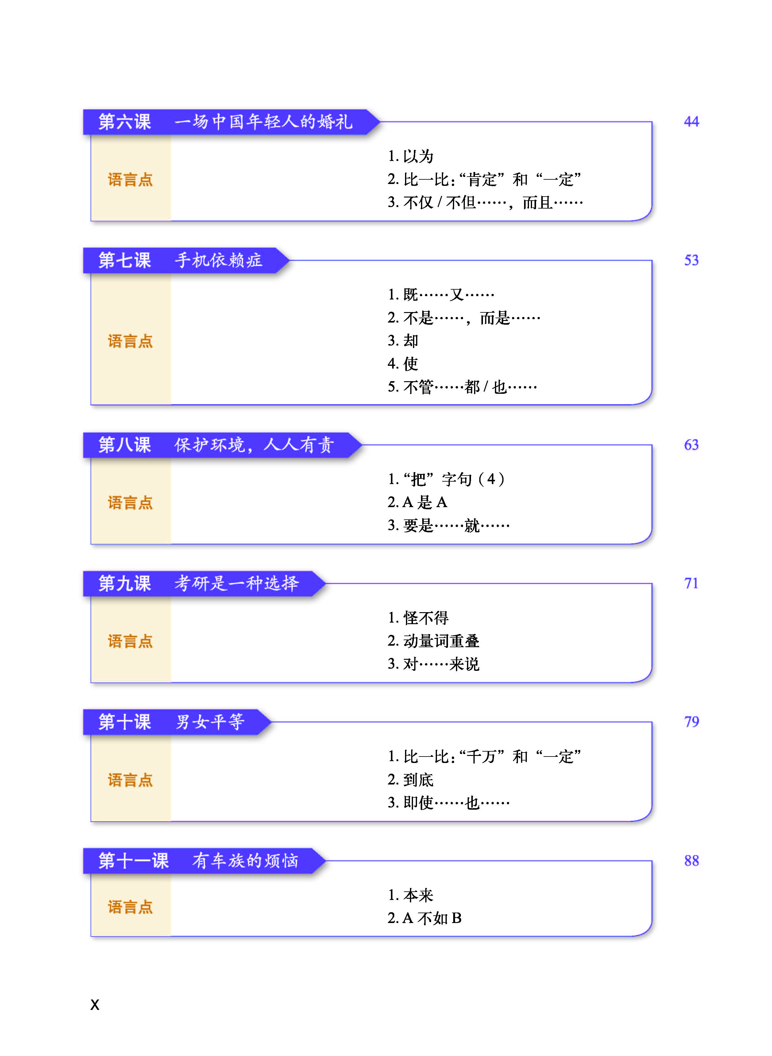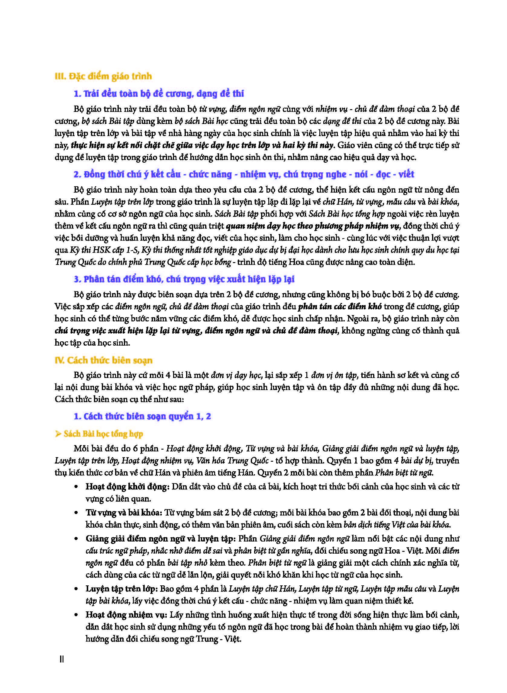 Bộ giáo trình này bao gồm 6 quyển Sách Bài học tổng hợp, 6 quyển Sách Bài tập tổng hợp. Bài học và Bài tập phối hợp với nhau, mỗi quyển 16 bài. Giáo trình tuân thủ nghiêm ngặt yêu cầu của “Đề cương thi HSK” và đề cương “Kỳ thi tốt nghiệp giáo dục dự bị đại học dành cho lưu học sinh chính quy du học tại Trung Quốc do chính phủ Trung Quốc cấp học bổng”, sắp xếp cụ thể như sau: