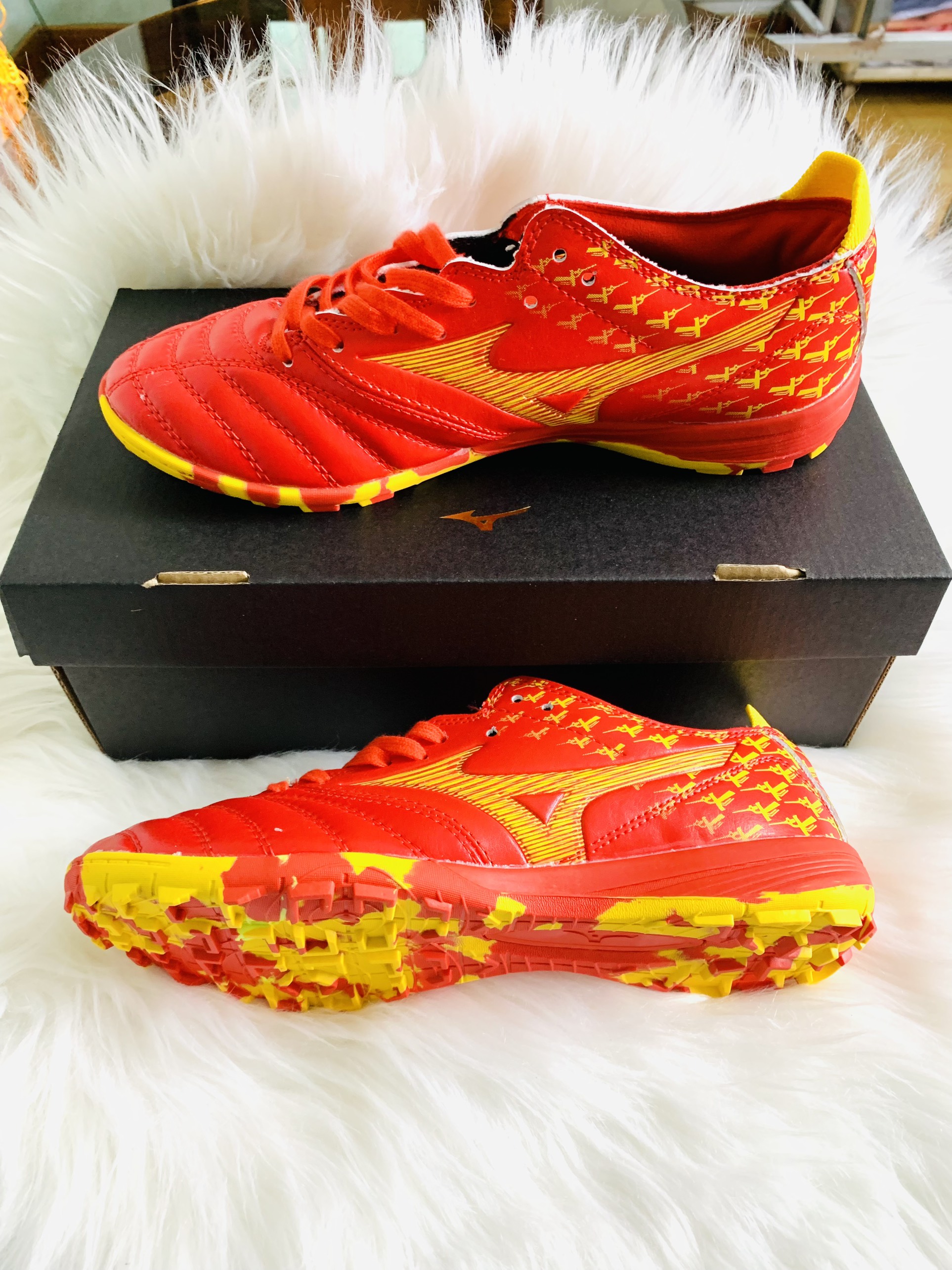 Phần hộp giày cũng được sử dụng các họa tiết này cùng tông màu đỏ nổi bật tạo nên điểm nhấn cho tổng thể sản phẩm.