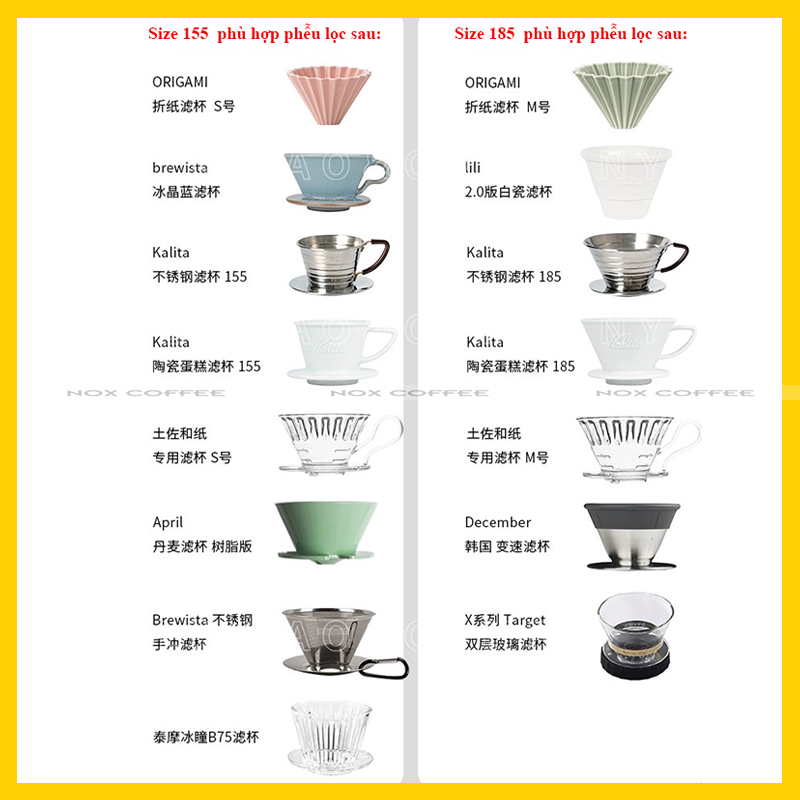 - Phễu Origami: phễu size S dùng giấy 155, phễu size M dùng giấy 185.
