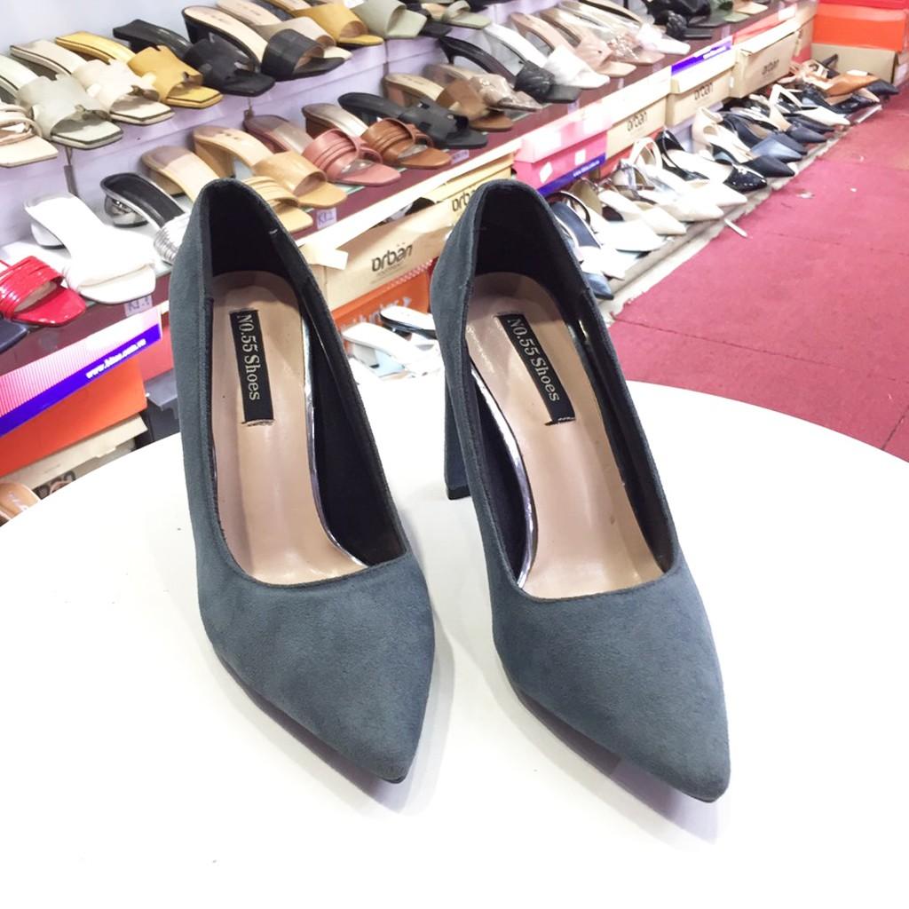 Giày cao gót thiết kế dáng mũi nhọn, chân nhọn phối đế vuông cao 6 cm. Giày có viền đính đá, làm bằng chất liệu da lộn, tone màu đẹp giúp các nàng dễ dàng