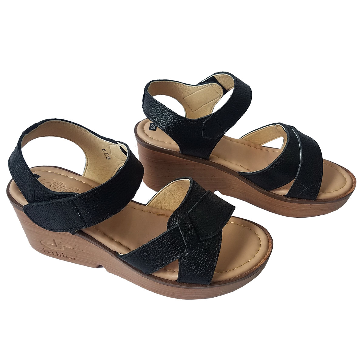 Dép xăng đan nữ đế vuông cao 5cm da bò thật