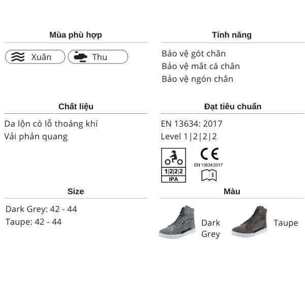Giày bảo hộ moto LS2 Downtown Man hiện đang được công ty BBI phân phối với 2 màu sắc: Dark Grey và Taupe, size từ 42-44.