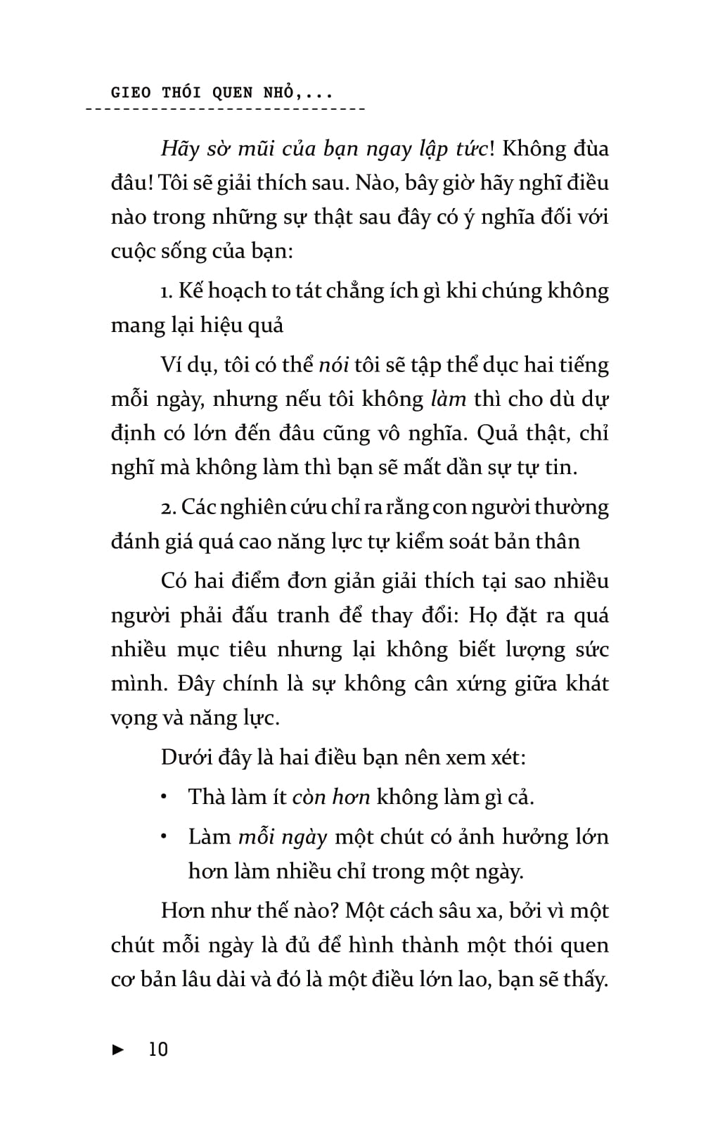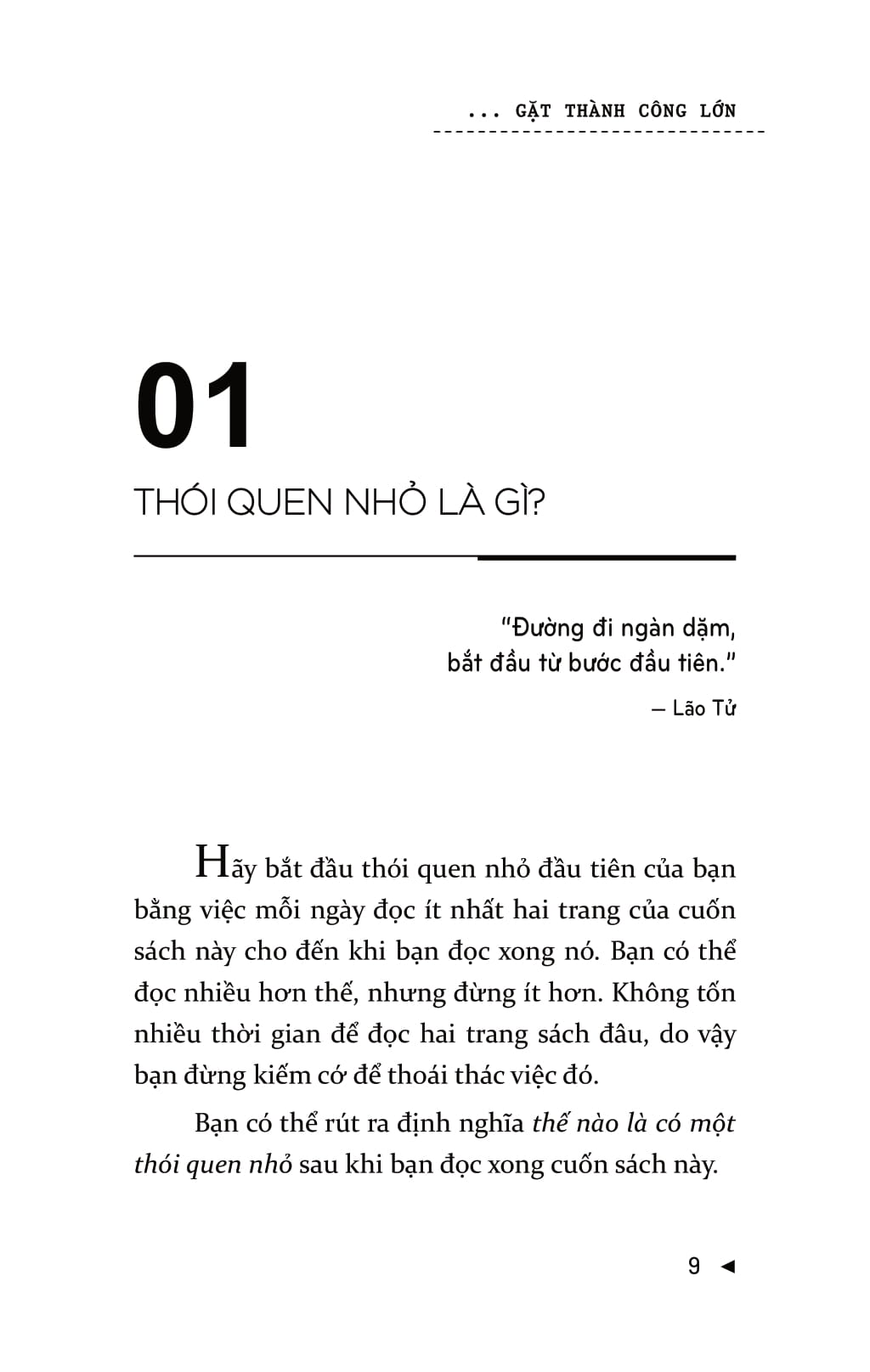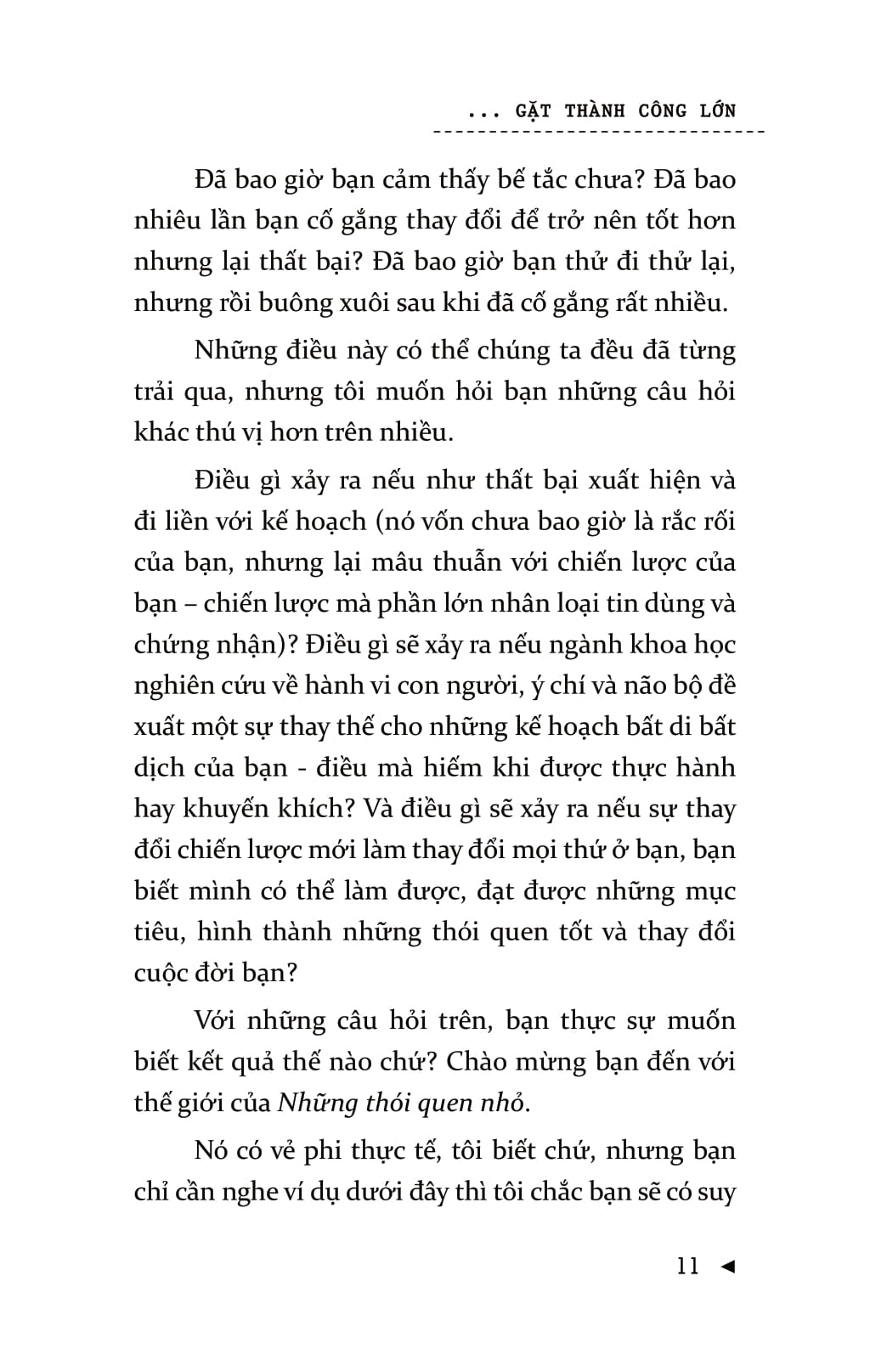 Mọi người thường nghĩ, chính họ là nguyên nhân khiến bản thân không thể đạt được sự thay đổi lâu dài. Nhưng vấn đề ở đây không phải là bản thân họ mà là chiến lược của họ. Bạn có thể đạt được những thành công to lớn mà không chịu bất cứ áp lực nào và sẽ không lặp lại thất bại nhờ những cách thức, phương pháp kiểu như: “lấy động lực”, sự kiên trì, và thậm chí là “làm đại đi”. Để đạt được những thay đổi lâu dài, bạn đừng cưỡng lại bộ não của mình. Khi bạn bắt đầu làm theo những chỉ thị của não bộ – theo dẫn dắt từ Gieo thói quen nhỏ gặt thành công lớn – thì những thay đổi tích cực, lâu dài sẽ không khó để đạt được! Gieo thói quen nhỏ gặt thành công lớn  là cuốn sách khoa học tìm ra sự mâu thuẫn trong hầu hết các chiến lược phát triển bản thân và lý giải nguyên nhân tại sao các thói quen nhỏ lại tạo nên sự thống nhất rõ rệt. Một thói quen nhỏ là hành vi tích cực rất nhỏ mà bạn bắt bản thân phải làm mỗi ngày. Nó “quá nhỏ để thất bại” nhưng lại mạnh mẽ không thể lường trước và là một chiến lược góp phần hình thành nên thói quen ưu việt.Cuốn sách gồm có bảy phần chính. Ba phần đầu của cuốn sách bàn về việc xây dựng thói quen, bộ não, ý chí, động lực và chỉ ra cách chúng liên hệ với nhau. Hai phần tiếp theo bàn về các kết luận mang tính lô-gic và cách khai thác một cách khoa học nhất những thông tin cung cấp. Ba phần cuối hướng dẫn bạn áp dụng những cách thức đó trong cuộc sống.Chiến lược này sẽ giúp cuộc sống của bạn trở nên hoàn hảo hơn 99% số người sống trên hành tinh này.