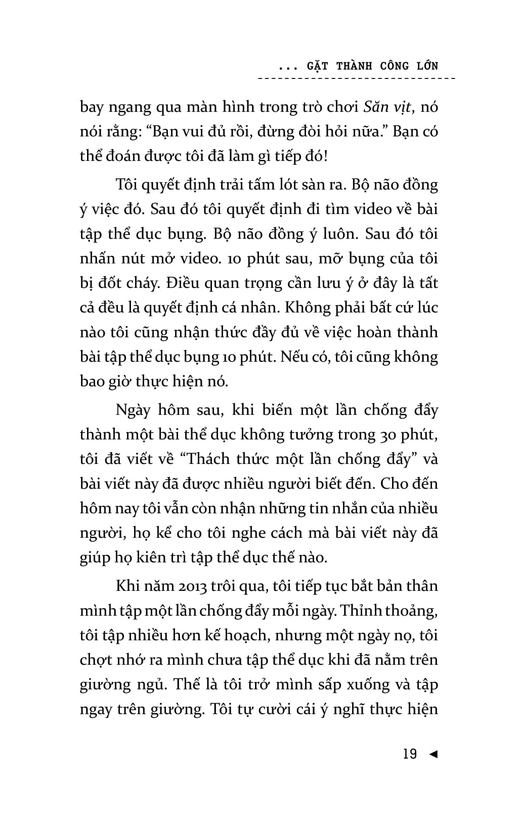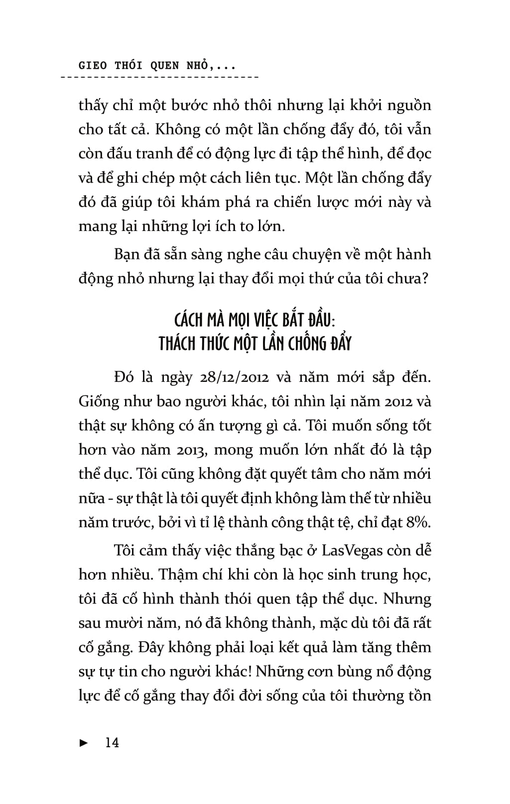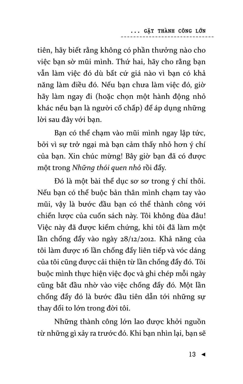 Mọi người thường nghĩ, chính họ là nguyên nhân khiến bản thân không thể đạt được sự thay đổi lâu dài. Nhưng vấn đề ở đây không phải là bản thân họ mà là chiến lược của họ. Bạn có thể đạt được những thành công to lớn mà không chịu bất cứ áp lực nào và sẽ không lặp lại thất bại nhờ những cách thức, phương pháp kiểu như: “lấy động lực”, sự kiên trì, và thậm chí là “làm đại đi”. Để đạt được những thay đổi lâu dài, bạn đừng cưỡng lại bộ não của mình. Khi bạn bắt đầu làm theo những chỉ thị của não bộ – theo dẫn dắt từ Gieo thói quen nhỏ gặt thành công lớn – thì những thay đổi tích cực, lâu dài sẽ không khó để đạt được! Gieo thói quen nhỏ gặt thành công lớn  là cuốn sách khoa học tìm ra sự mâu thuẫn trong hầu hết các chiến lược phát triển bản thân và lý giải nguyên nhân tại sao các thói quen nhỏ lại tạo nên sự thống nhất rõ rệt. Một thói quen nhỏ là hành vi tích cực rất nhỏ mà bạn bắt bản thân phải làm mỗi ngày. Nó “quá nhỏ để thất bại” nhưng lại mạnh mẽ không thể lường trước và là một chiến lược góp phần hình thành nên thói quen ưu việt.Cuốn sách gồm có bảy phần chính. Ba phần đầu của cuốn sách bàn về việc xây dựng thói quen, bộ não, ý chí, động lực và chỉ ra cách chúng liên hệ với nhau. Hai phần tiếp theo bàn về các kết luận mang tính lô-gic và cách khai thác một cách khoa học nhất những thông tin cung cấp. Ba phần cuối hướng dẫn bạn áp dụng những cách thức đó trong cuộc sống.Chiến lược này sẽ giúp cuộc sống của bạn trở nên hoàn hảo hơn 99% số người sống trên hành tinh này.