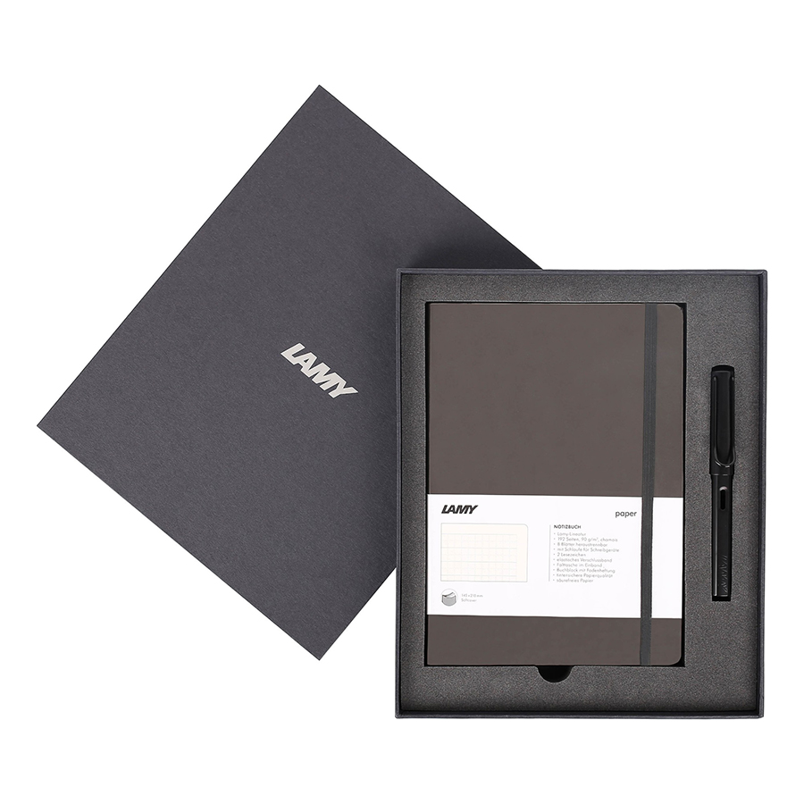 - Gift Set Lamy Notebook A6 Softcover Black + Lamy AL-Star Bronze - GSA6-AL003 đi kèm một chiếc bút máy LAMY Al-star vỏ nhôm tinh tế. - Bộ quà tặng được đặt trong một hộp sang