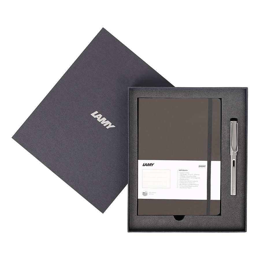 - Gift Set Lamy Notebook A6 Softcover Black + Lamy AL-Star Bronze - GSA6-AL003 đi kèm một chiếc bút máy LAMY Al-star vỏ nhôm tinh tế. - Bộ quà tặng được đặt trong một hộp sang
