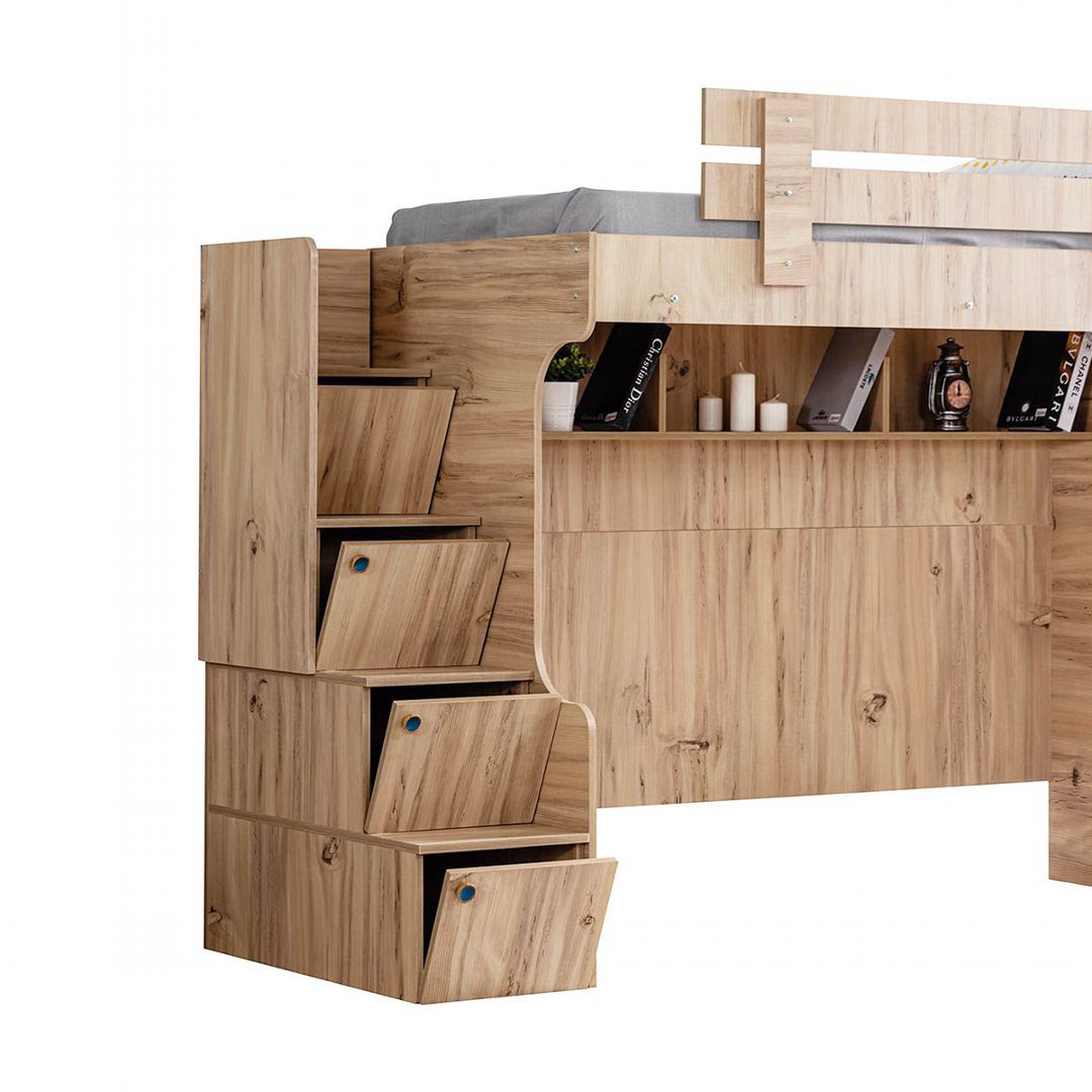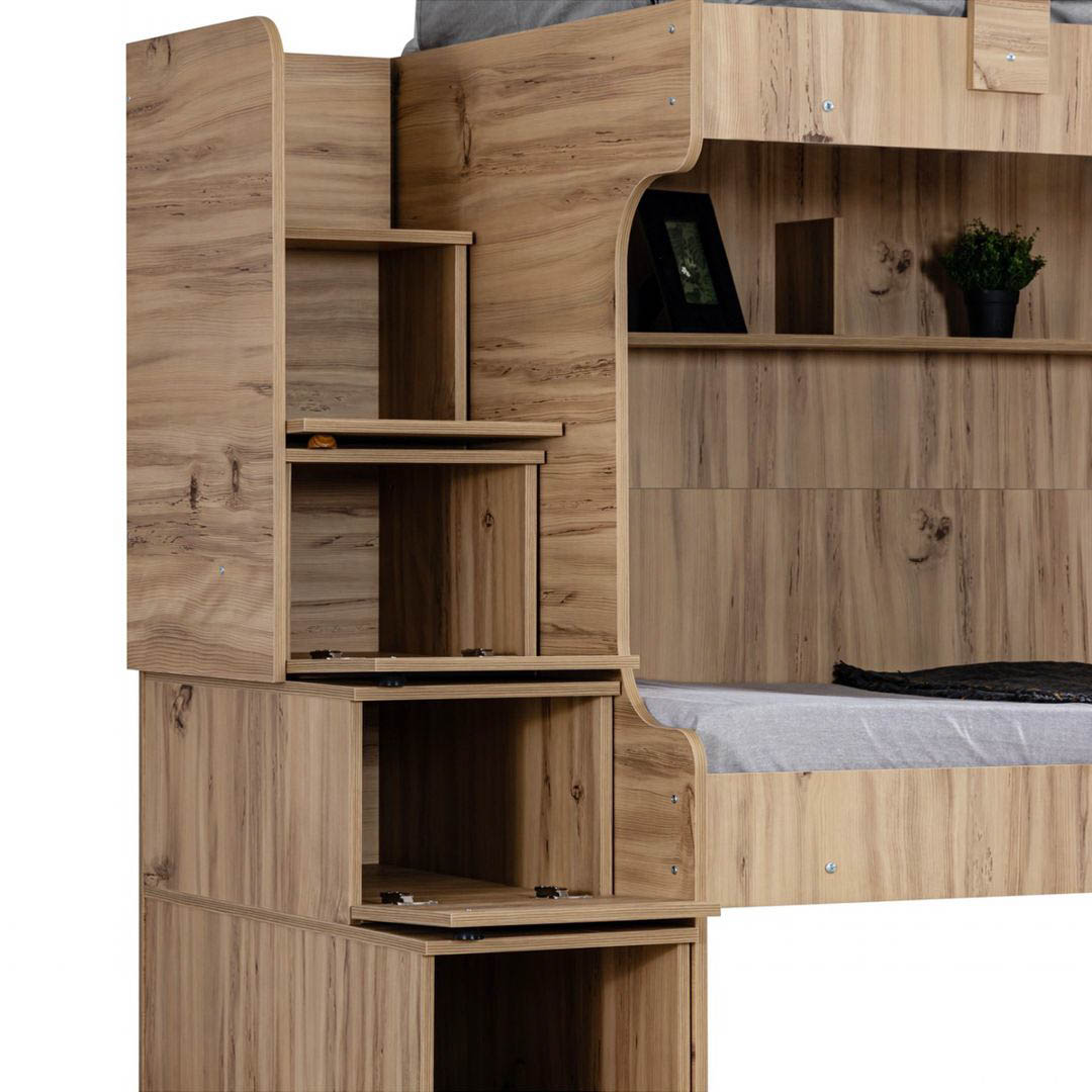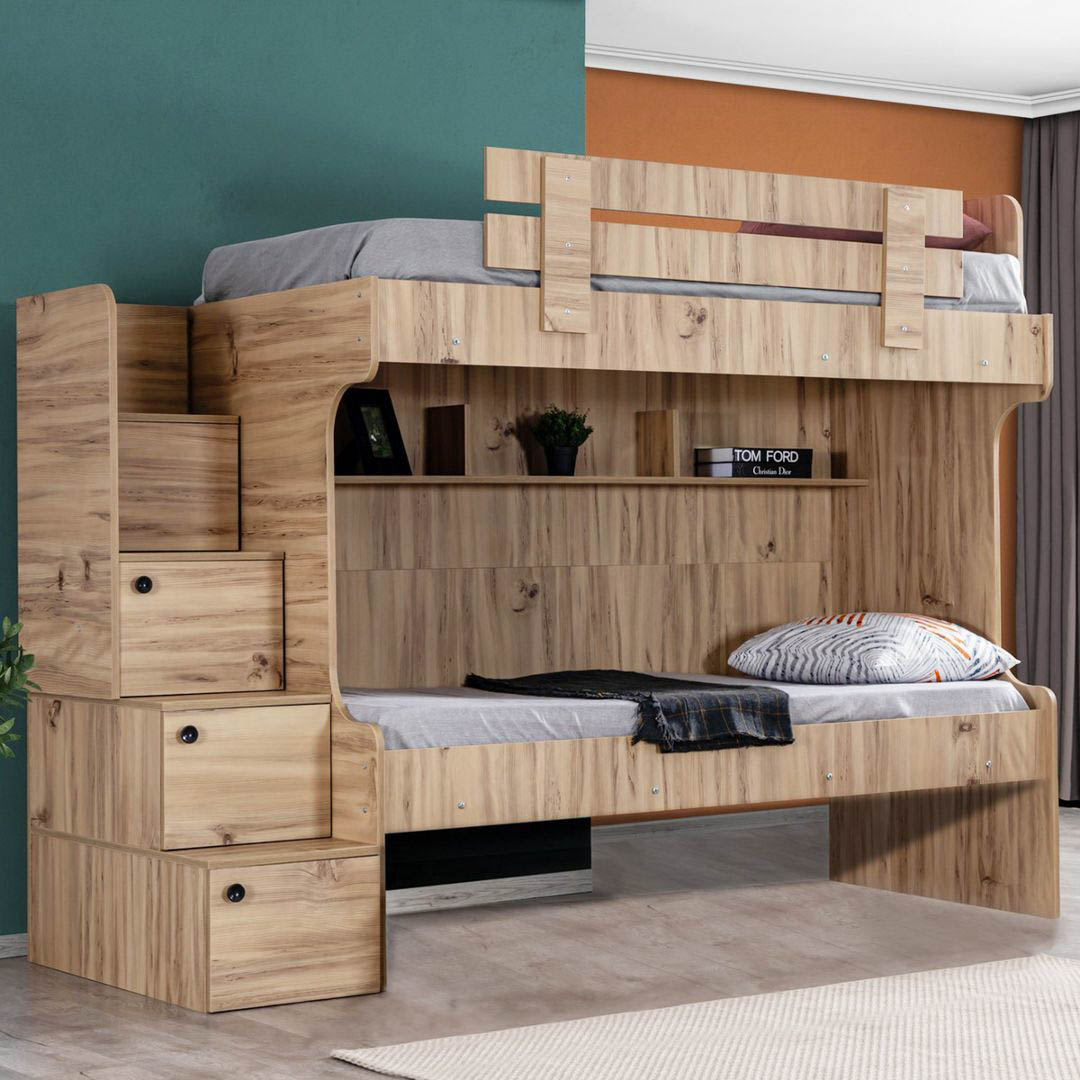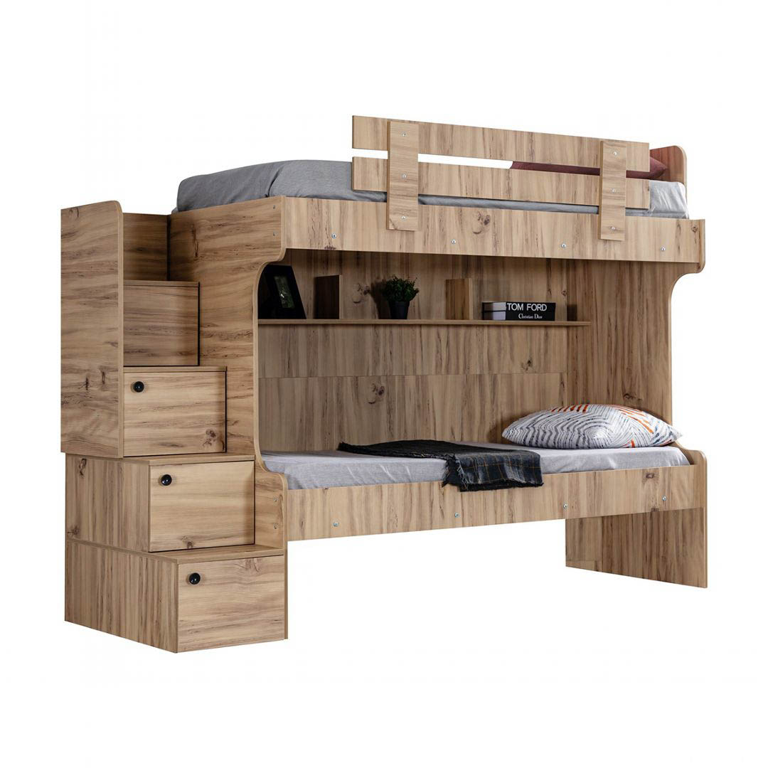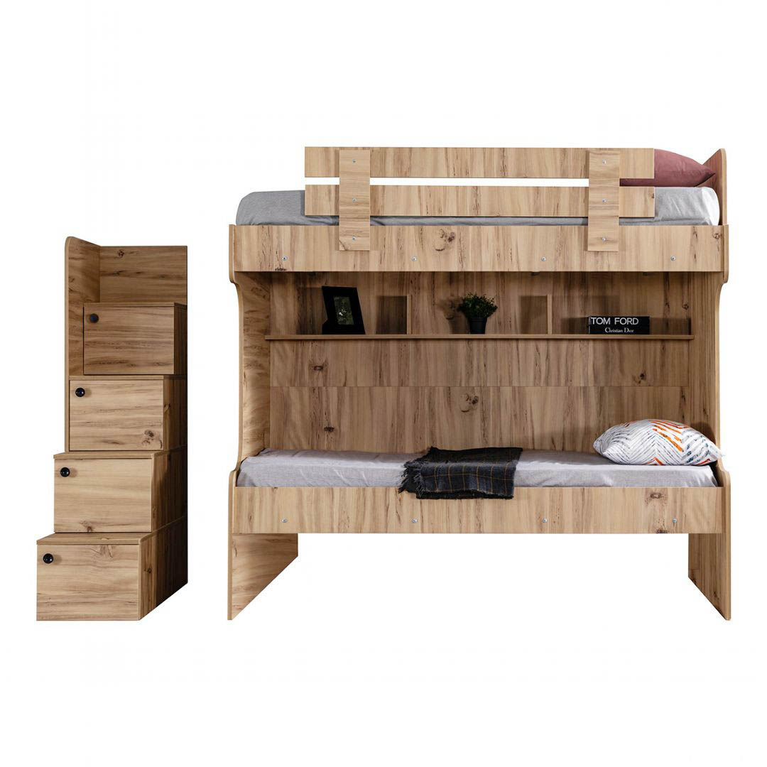 Giường tầng xuất khẩu Derry có kích thước lọt lòng giường trên/dưới là 100x193 cm, phủ bì 202x110x165 cm. Khoảng cách giữa 2 tầng là 95 cm, cầu thang bố trí bên phải. Chân trụ