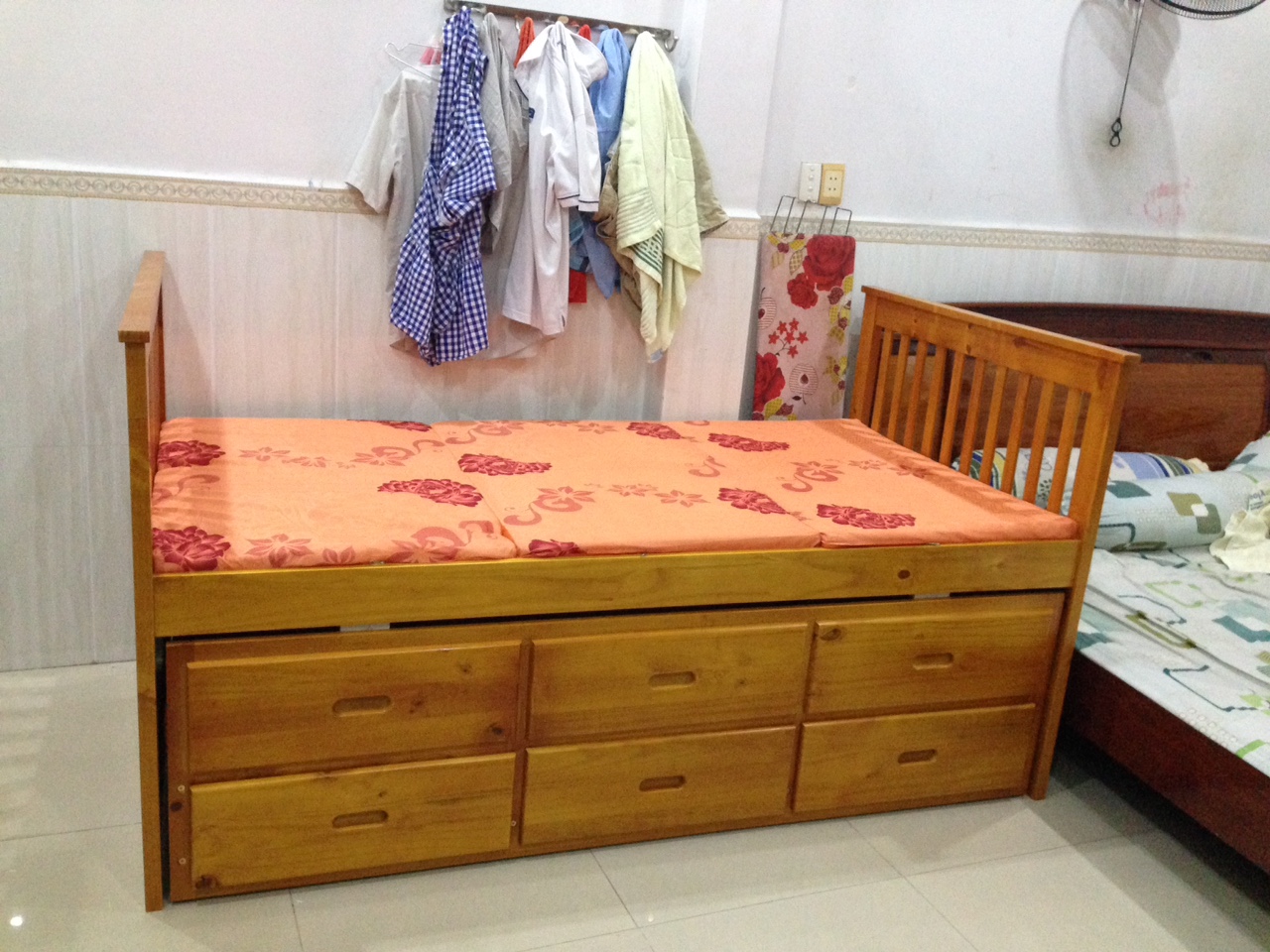 + Chất liệu: Khung giường gỗ thông Newzealand, phân tầng, Vách, đáy hộc gỗ công nghiệp, thang giường MDF chịu lực + Kích thước: kích thước phủ bì, tầng trên ưới 1mx2m Giường tầng hộp