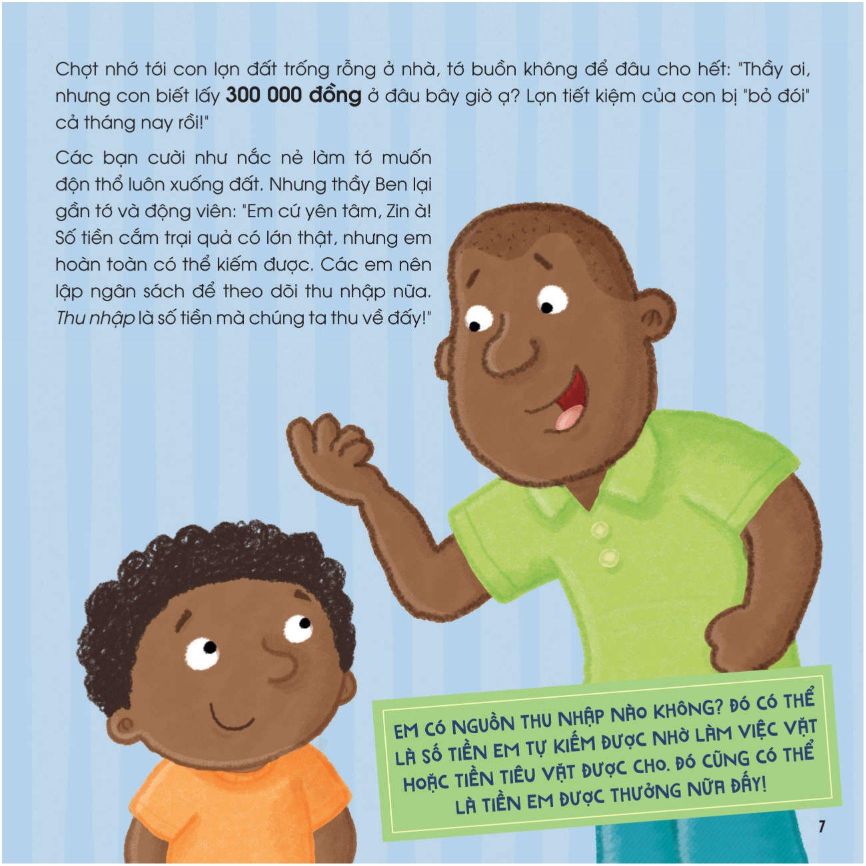 Thật vậy, với 06 cuốn sách truyện cùng những nhân vật sinh động trong các tình huống đời thường quen thuộc của bộ sách này, trẻ sẽ được làm quen với những kiến thức căn bản nhất về tiền như: Chi phí, thu nhập, tiết kiệm, mua sắm, theo dõi thu chi, cân nhắc đưa ra lựa chọn giữa nhu cầu và mong muốn,…