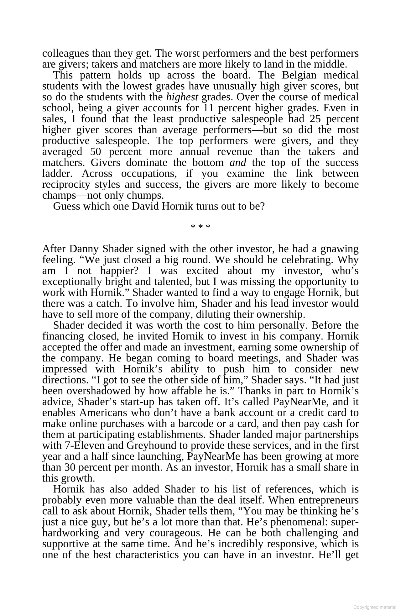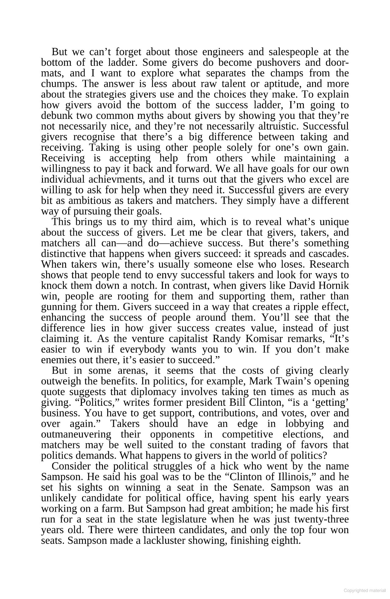 GIVE AND TAKE presents the fascinating secrets to givers' success. The results are unequivocal: givers gain big. Jack Welch, Richard Branson, Jon Huntsman Sr. - all of them are givers. In a world in which so many takers such as Bernard Madoff and Raj Rajaratnam have ruined lives and reputations, this book will reassure readers that the real power lies in becoming a giver. Since the vast majority of people aren't born givers, Grant not only presents the case for why givers win, he also offers their hidden strategies for winning.