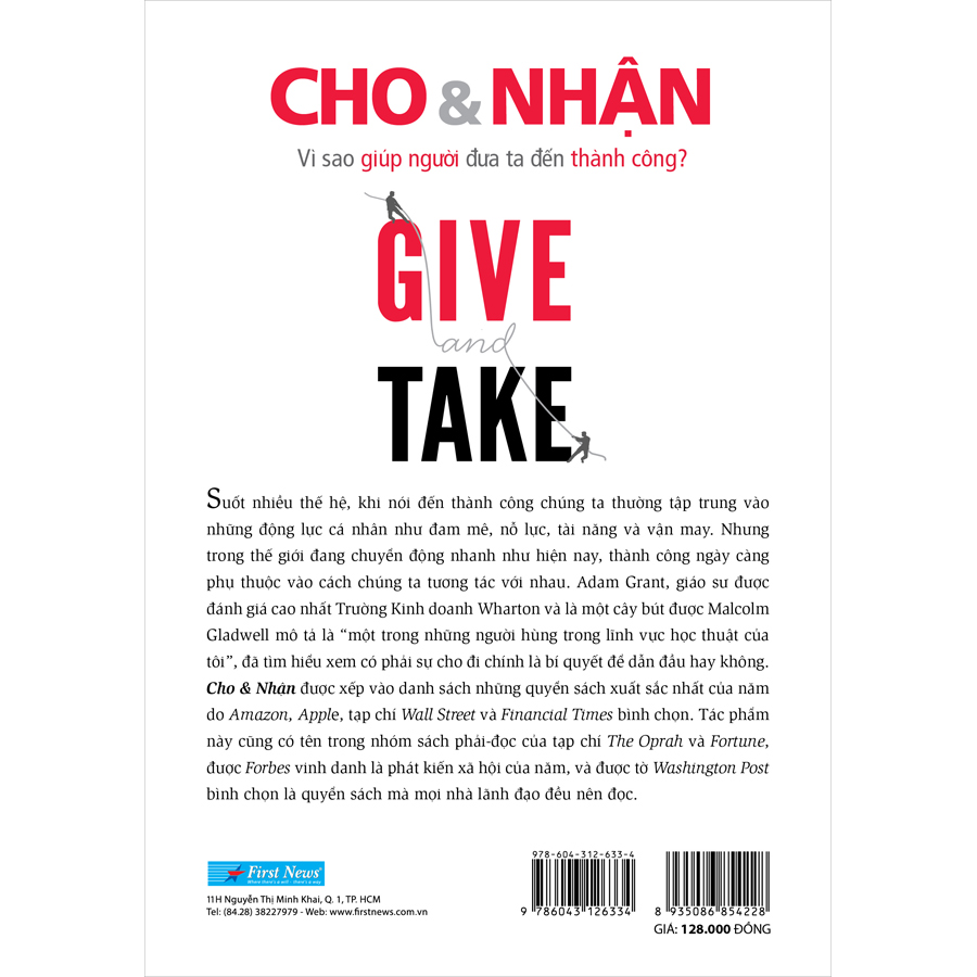 Được giới chuyên môn, bao gồm cả những tên tuổi như Dan Pink, Tony Hsieh, Dan Ariely, Susan Cain, Robert Cialdini,… cũng như đội ngũ lãnh đạo của những tập đoàn lừng danh như Google, McKinsey, Merck, Estée Lauder, Nike, và cả NASA đánh giá cao, “Cho và nhận” thực sự là một cuốn cẩm nang dạy ta cách thức làm việc, hành xử sao cho đạt hiệu quả cao nhất, với hiệu quả không giới hạn cho một cá nhân nào, mà bao phủ lên thành công của tổ chức cũng như cộng đồng.