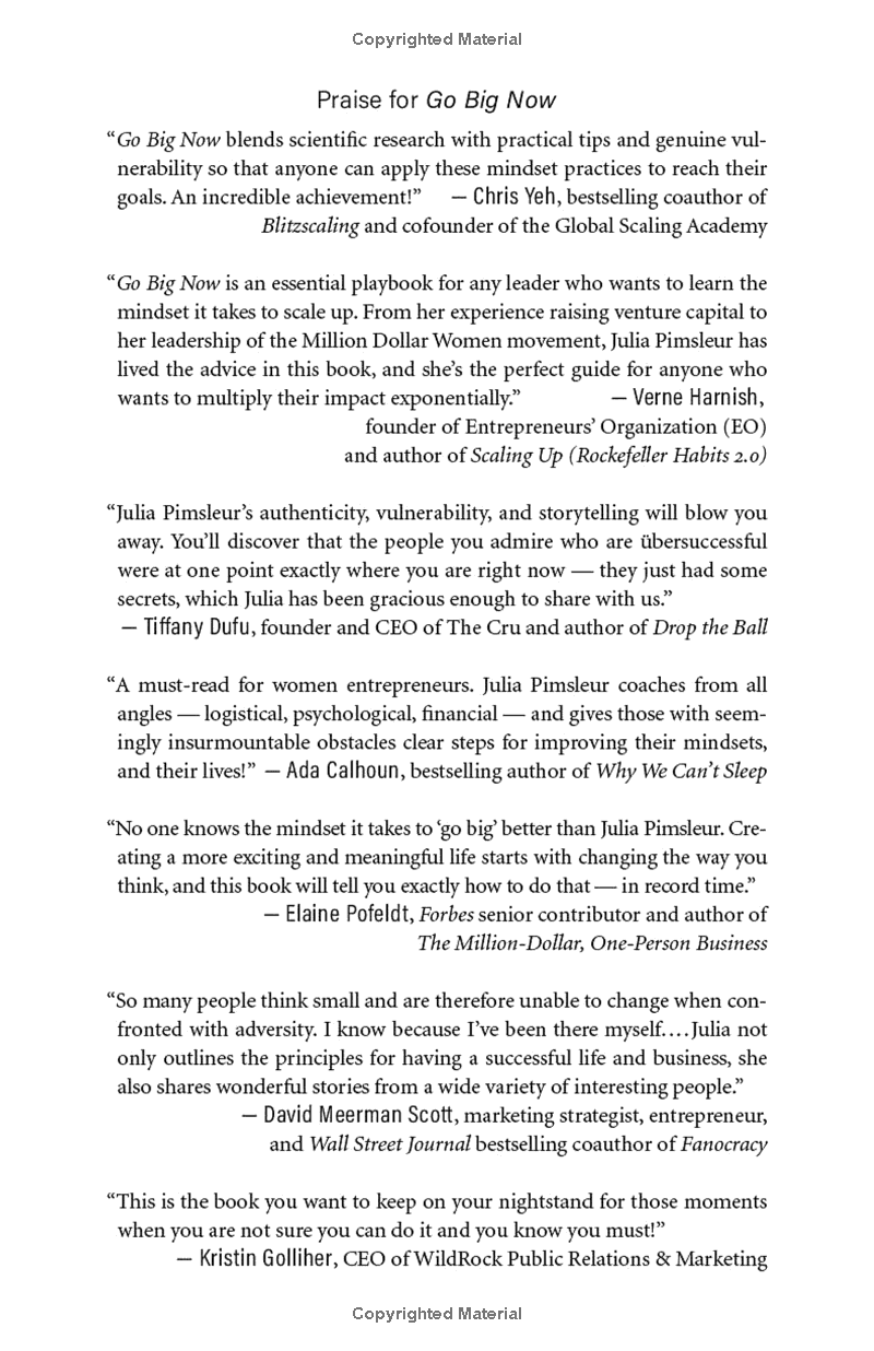 What’s the biggest challenge you face if you want to accomplish great things? It’s getting and keeping the right mindset, according to the hundreds of high achievers Julia Pimsleur has interviewed and worked with as a business coach. In Go Big Now, Pimsleur distills two decades of studying complex mindset practices into eight essential “mindset keys” that can be used by anyone to get the Go Big Mindset and achieve ambitious professional and life goals. Pimsleur shares personal stories of how she used these keys to raise venture capital and build multimillion-dollar companies, and illustrates each key with an example from a leader, CEO, or celebrity whose mindset catapulted them to success. You’ll learn to reframe perceived setbacks, replace unhelpful thoughts and limiting beliefs with empowering ones, and stay motivated to pursue your big goal, even in the face of massive hurdles. With the Go Big Mindset, you’ll boost your mental resilience and discover how to think your way to bigger, better results.