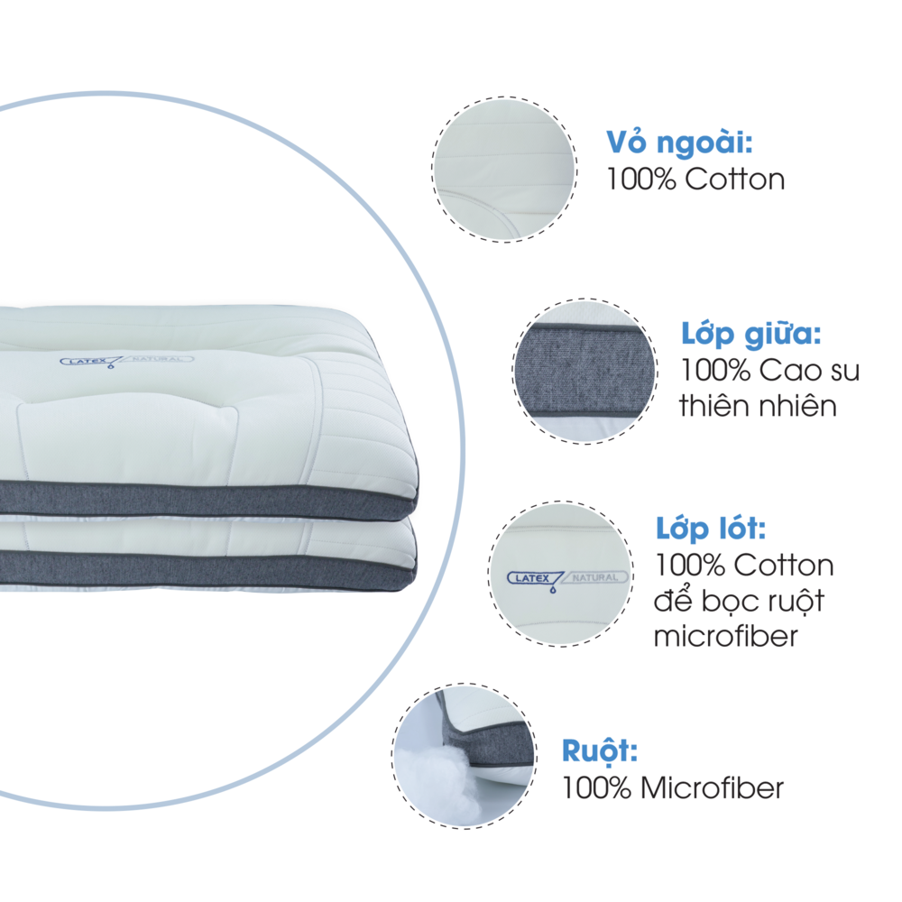 - Ruột: 100% Microfiber Ưu điểm của gối chức năng Functional Natural Latex Pillow NIN House chăm sóc vai gáy cổ