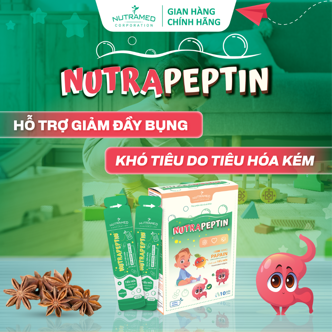 NUTRAPEPTIN - Hỗ trợ giảm đầy bụng, khó tiêu do tiêu hoá kém THÀNH PHẦN ️Alpha Amylase, papain, chiết xuất Tiểu hồi, chiết xuất Tía tô đất, chiết xuất Đại hồi CÔNG DỤNG ️Hỗ trợ