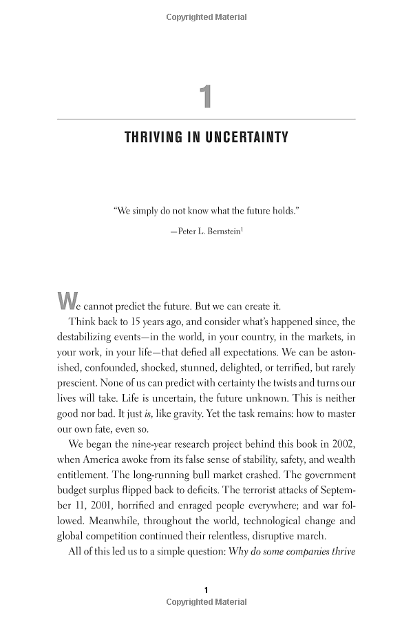 Ten years after the worldwide bestseller Good to Great, Jim Collins returns with another groundbreaking work, this time to ask: Why do some companies thrive in uncertainty, even chaos, and others do not? Based on nine years of research, buttressed by rigorous analysis and infused with engaging stories, Collins and his colleague, Morten Hansen, enumerate the principles for building a truly great enterprise in unpredictable, tumultuous, and fast-moving times.