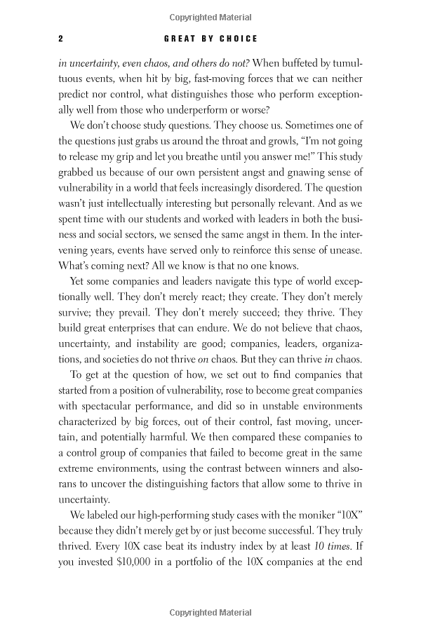 With a team of more than twenty researchers, Collins and Hansen studied companies that rose to greatness—beating their industry indexes by a minimum of ten times over fifteen years—in environments characterized by big forces and rapid shifts that leaders could not predict or control. The research team then contrasted these “10X companies” to a carefully selected set of comparison companies that failed to achieve greatness in similarly extreme environments.