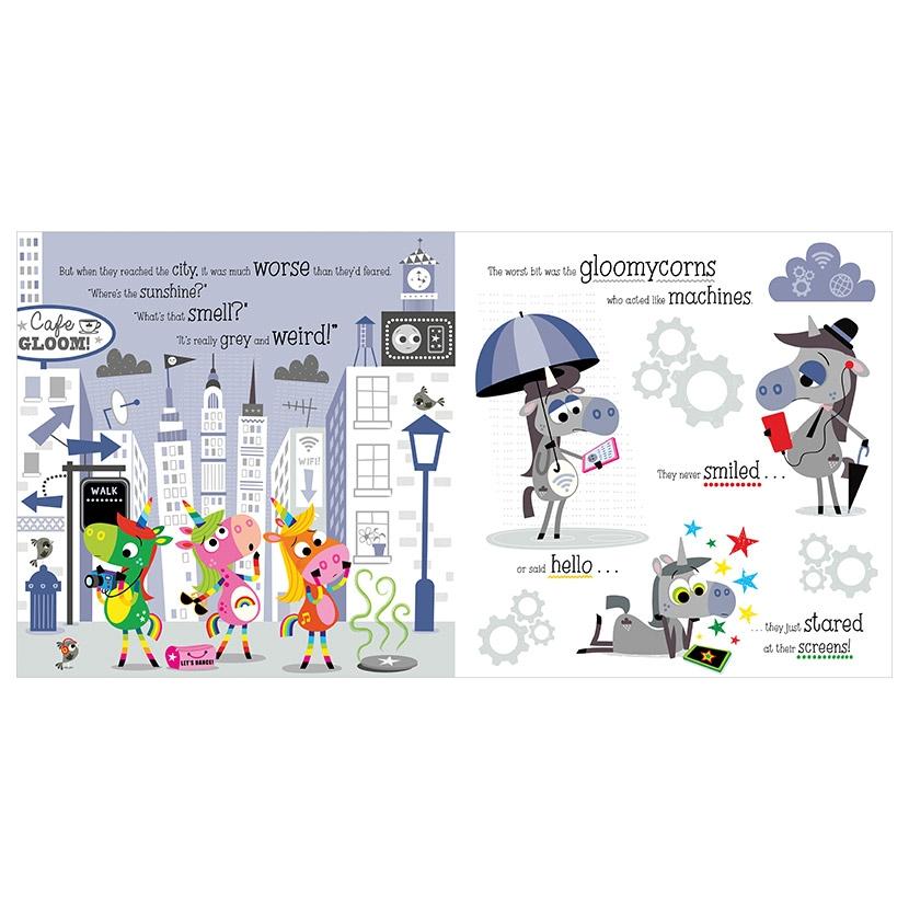 Introducing the next book in our popular groovicorns range! In this story, the groovicorns visit Moanhattan city to try and cheer up the grey city gloomicorns, but the gloomicorns never look up from their phones! Adults and children alike will enjoy this story, with a great message about interacting with the world, not our screens! The book also features amazing two-way sequins on the cover. FUNNY GROOVICORNS STORY WITH TWO-WAY SEQUINS ON THE COVER