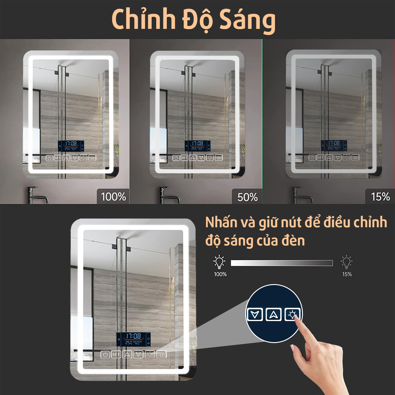 - Có cổng USB nên quý khách có thể cắm sạc, mic, đèn,.... ƯU ĐIỂM NỔI BẬT CỦA SẢN PHẨM Nút cảm ứng vẫn nhạy dù tay ướt Có 2 loa phát nhạc, nên âm thanh lớn, có thể tăng giảm âm lượng bằng nút cảm ứng Mặt sau gương có mút bảo vệ, tránh nước văng vào nguồn điện nên rất an toàn cho người sử dụng Thiết kế hình chữ nhật đứng phù hợp với kích thước nhà tắm của đa số gia đình Việt Nam Quý khách có thể đến xem thành phẩm trực tiếp tại shop bằng cách liên hệ với shop CHẾ ĐỘ BẢO HÀNH • Đổi trả sản phẩm trong 7 ngày sau nhận hàng • Bảo hành 12 tháng (1 năm)