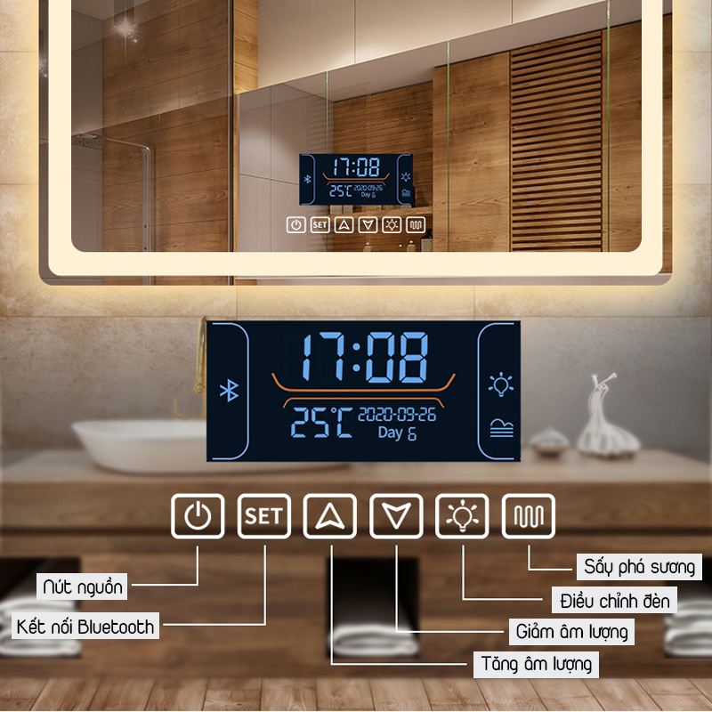 - Bộ sản phẩm gồm: 1 gương, 2 tắc kê, 2 vít Kết nối với nguồn điện 220V bằng phích cắm Bộ chuyển đổi nguồn điện sẽ chuyển điện 220V thành điện áp thấp hơn để dùng cho đèn LED (12V) và cổng USB CÁC CHỨC NĂNG CỦA GƯƠNG