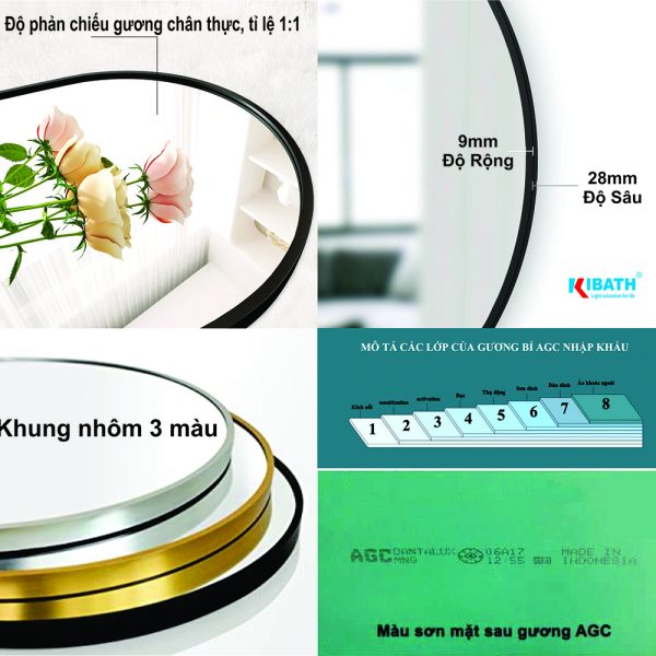 Chất Liệu: Phôi gương nhập khẩu từ tập đoàn AGC (Bỉ) nhà máy sản xuất tại Indonesia dày 5ly.