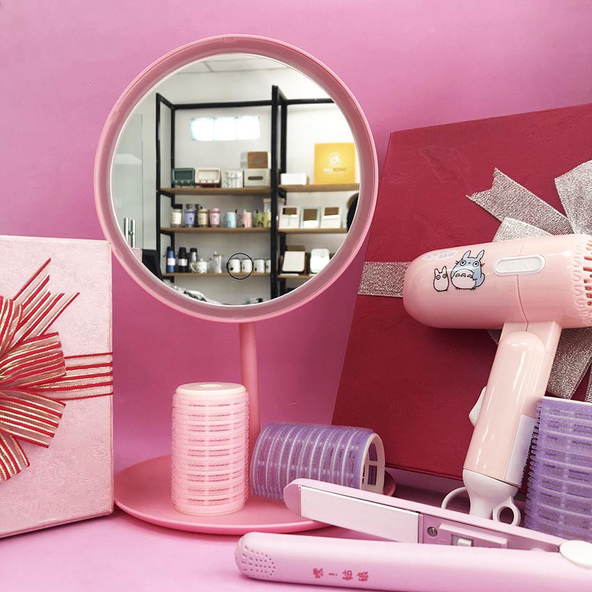 ✨Gương Trang Điểm Để Bàn Có Đèn LED Cao Cấp Bằng Nhựa Hình Tròn Trắng Hồng Pin Bền Sạc Nhanh Tặng Cáp Sạc Giao Màu Ngẫu Nhiên