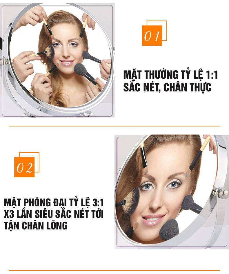 - Có 2 mặt, 1 mặt thường và 1 mặt phóng đại gấp 3 lần, mặt gương siêu nét. Khi cần soi sát mặt chỉ cần xoay mặt gương phóng đại ra. Điều này cực kỳ tiện lợi sẽ giúp bạn ngồi yên 1 chỗ mà vẫn soi kỹ từng chi tiết nhỏ nhất trên khuôn mặt