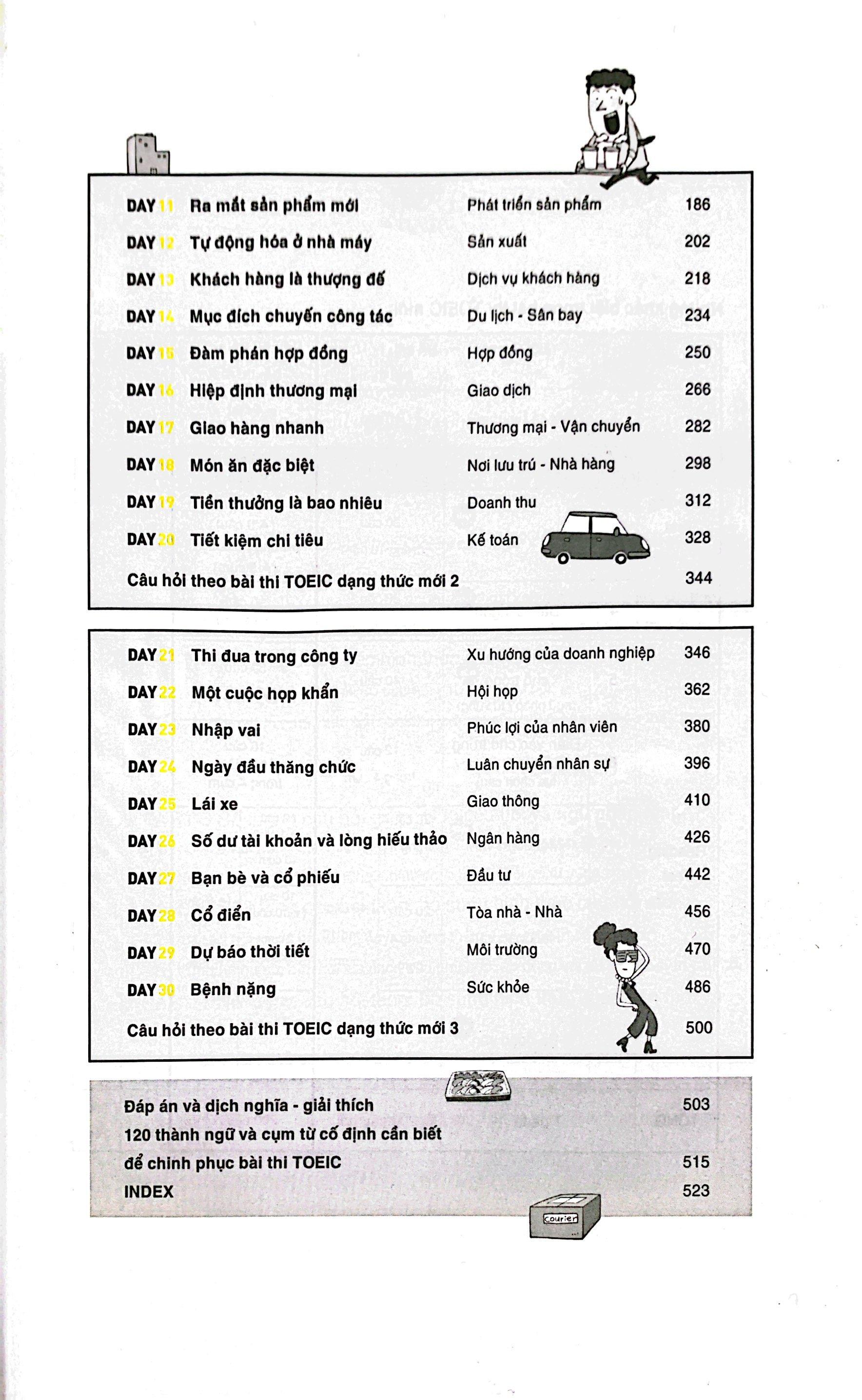 Cuốn sách chia các từ vựng thành 30 chủ đề khác nhau tương ứng với 30 ngày học. Mỗi bài học luôn bắt đầu bằng một mẩu truyện tranh ngắn hài hước, thú vị; tiếp đó là các từ vựng đi kèm với những ví dụ cụ thể có liên quan đến chủ đề của bài. Người học nhờ đó sẽ nhớ từ tốt hơn, nắm được cách sử dụng của từ và cụm từ và cũng mở rộng được được vốn hiểu biết của m.ình trong lĩnh vực có liên quan.