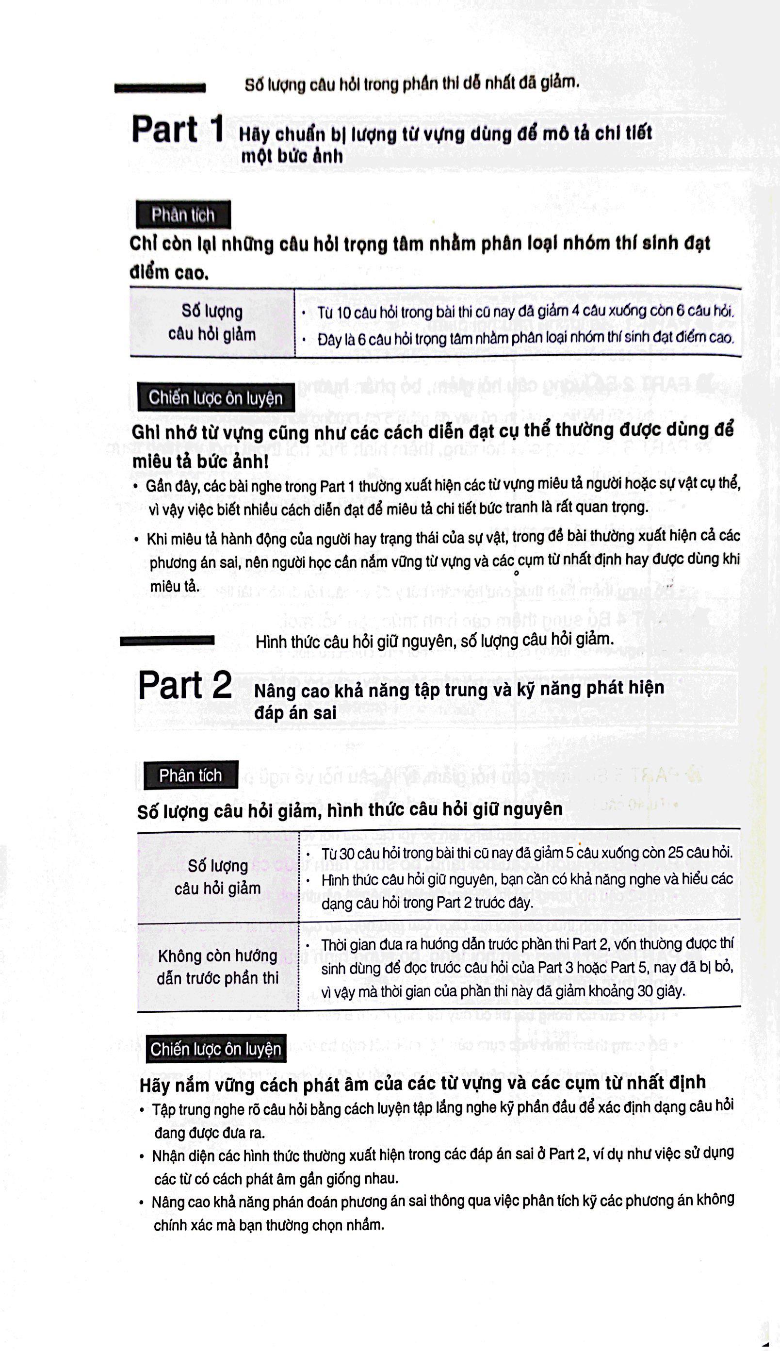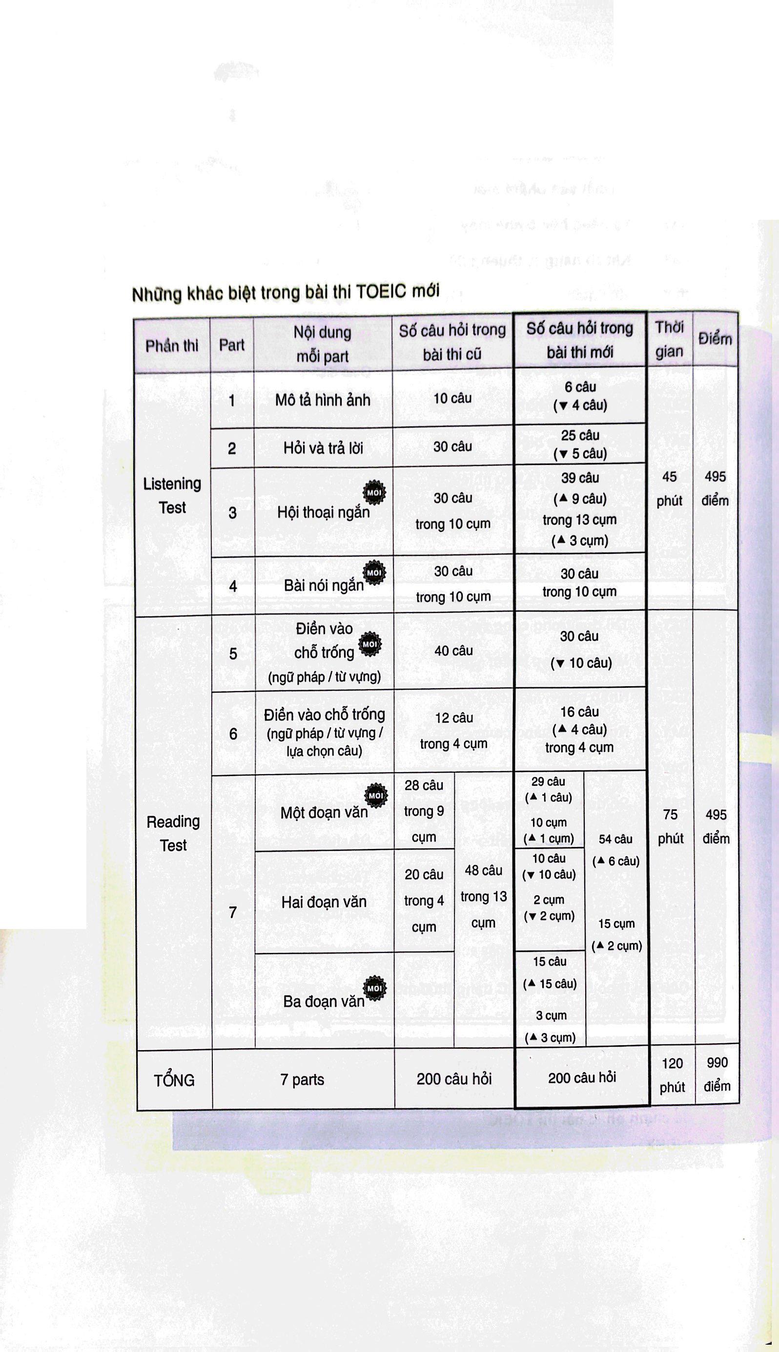 Bạn sẽ liên tục gặp trong sách những nội dung được trình bày nổi bật dưới tiêu đề Bài thi TOEIC dạng thức mới. Đây là những nội dung giúp người học nắm bắt được điểm nhấn và khuynh hướng xuất hiện của các từ vựng trong đề thi. Ngoài ra, sách còn đưa ra những lưu ý về ngữ pháp cũng như những nhầm lẫn mà thí sinh thường mắc phải trong quá trình làm bài thi.
